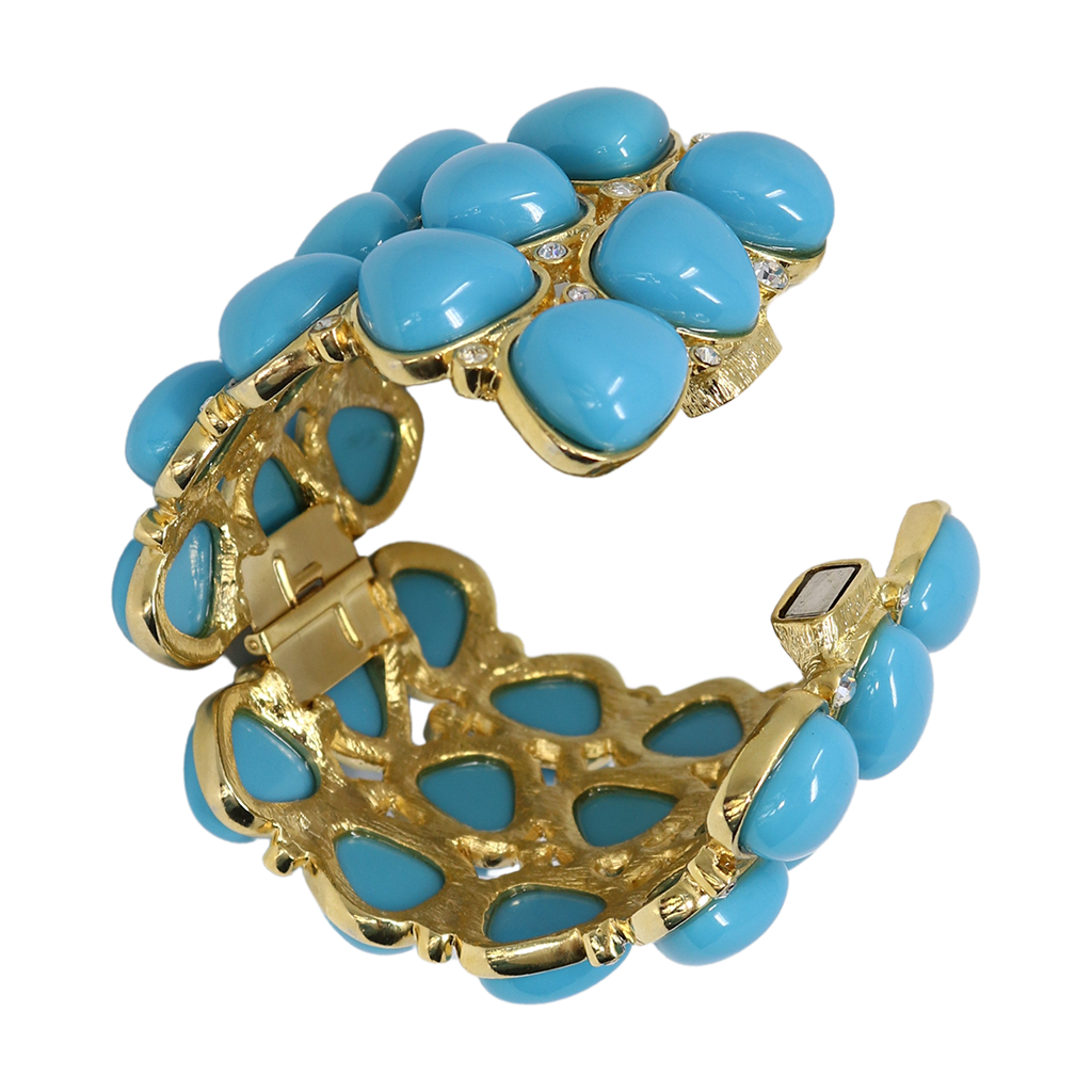This 3 row gold and crystal hinged bracelet featuring turquoise dots and triangle cabs adds the perfect pop of color to any look.
