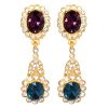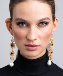 Emeralds sparkle on these dramatic and glamorous pearl drop fishhook earrings set in gold with crystal accents.