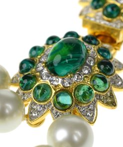 A Kenneth Jay Lane classic, this triple row of faux, glass-based pearls are finished with a beautiful gold-plated, flawed emerald stone clasp while honoring Former First Lady Barbara Bush.