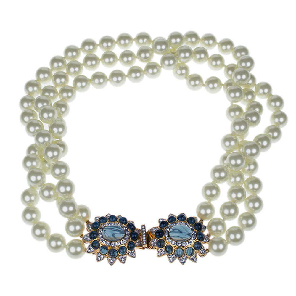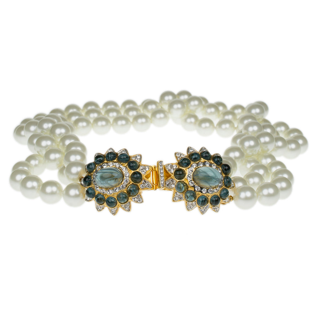 Mrs. Bush would often buy this pearl and sapphire clasp necklace with matching clip earrings. She would be photographed wearing them, and then sign the enlarged framed picture before donating both the picture and the jewelry. The set once sold at a charity auction for $10,000.Matching Earrings here: Gold & Sapphire Cabochon Center Clip Earrings.