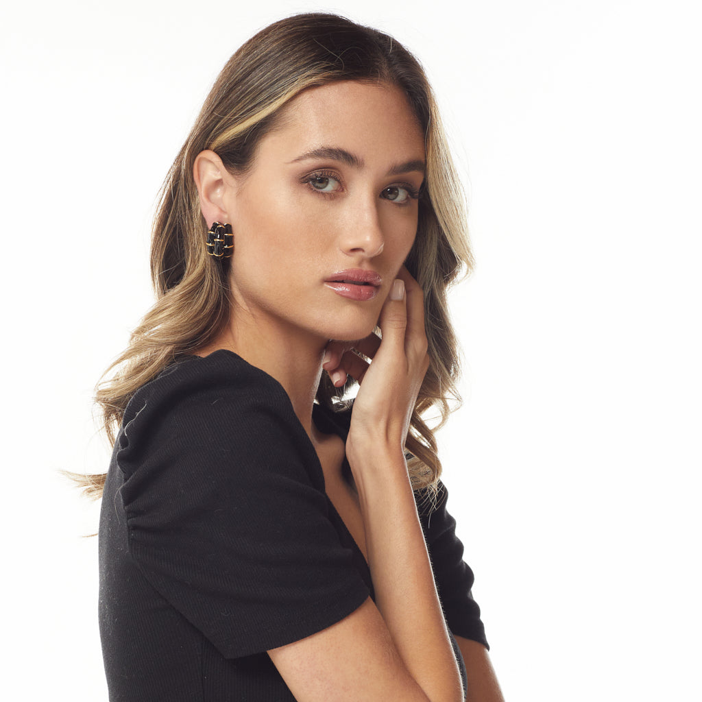 This mesmerizing gold and black enamel triple bamboo hoop clip earring is a timeless piece.
