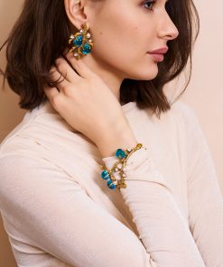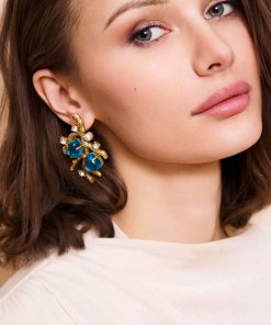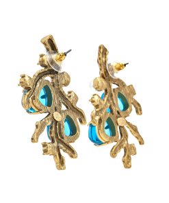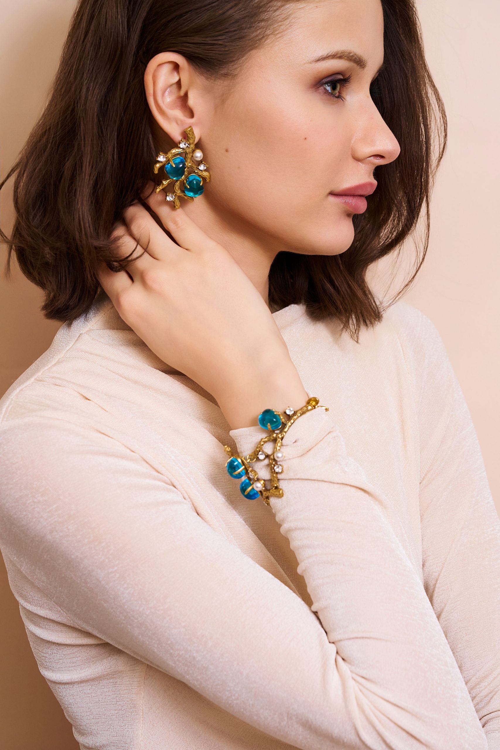 These gold-plated post earrings feature a sea branch design with 8 millimeter faux pearls, crystals, and aqua cabochons, offering an elegant and ocean-inspired look.