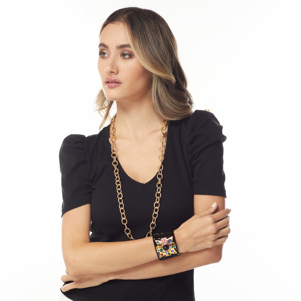Plated in 22-karat gold electroplating, dipped in enamel, and covered with gorgeous multicolored faux gemstones, Kenneth Lane’s Chanel-inspired Maltese Cross Cuff is an iconic piece that was famously worn by the legendary Diana Vreeland, and later sold at auction.