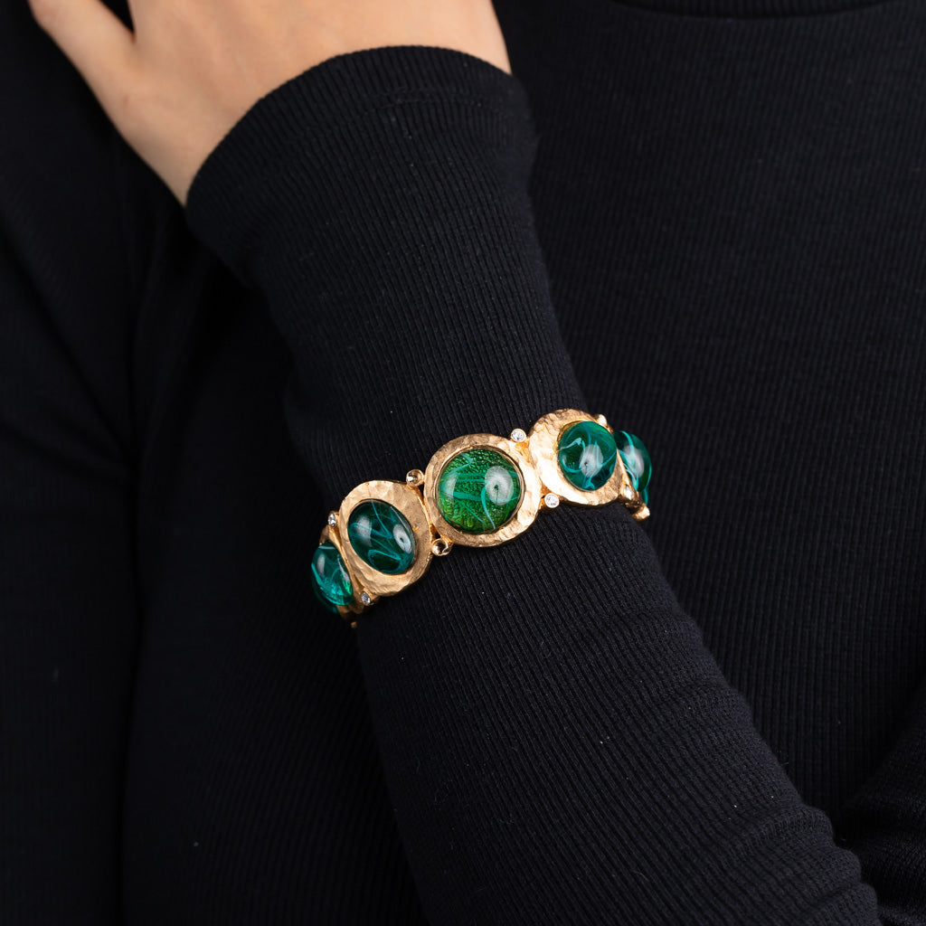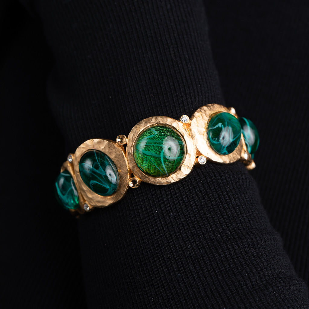 Add a little sparkle and shine to your wrist with this ornate emerald cabochon bangle featuring crystal accents to dress up any outfit. Pair with our Flawed Emerald Cabochon Drop Clip Earrings.