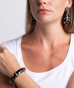 Bright gems shine against a black enamel back drop on this statement hinged bangle. Pair with our Gemstone Clip Earrings.