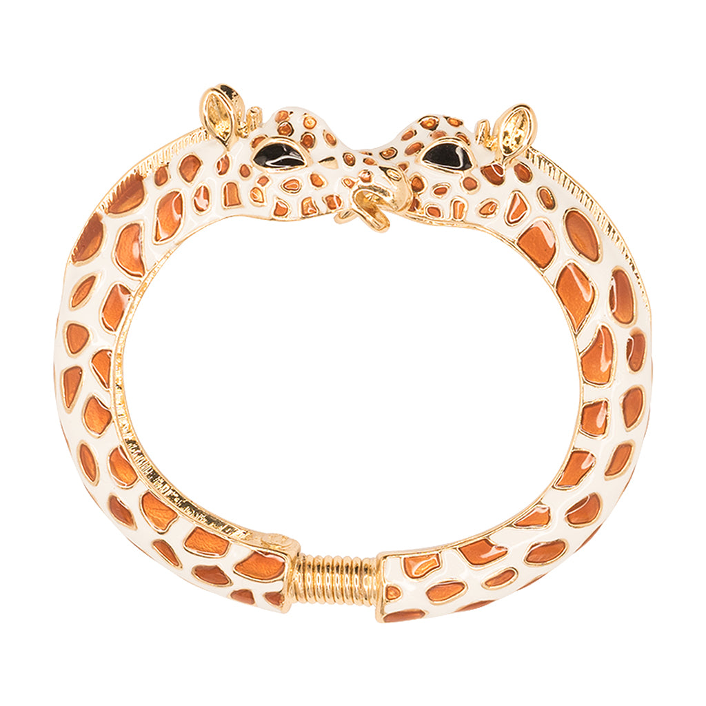 Get your animal instincts on with this gold plated double headed giraffe inspired hinge bangle. White and tan enamel are carefully used to form this elegant pattern.