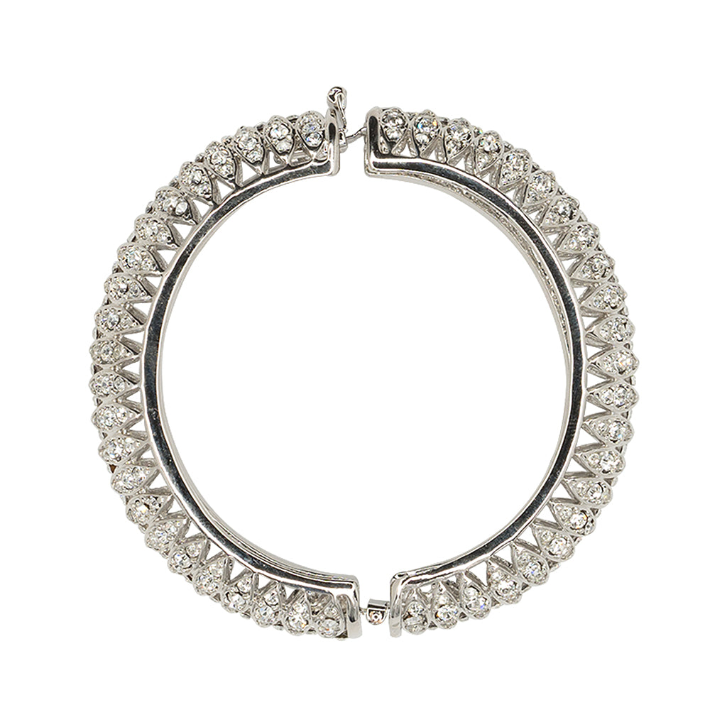A Jackie Onassis original, this silver bangle with bright pavé crystals will glimmer and shine as a magnificent piece on your wrist.
