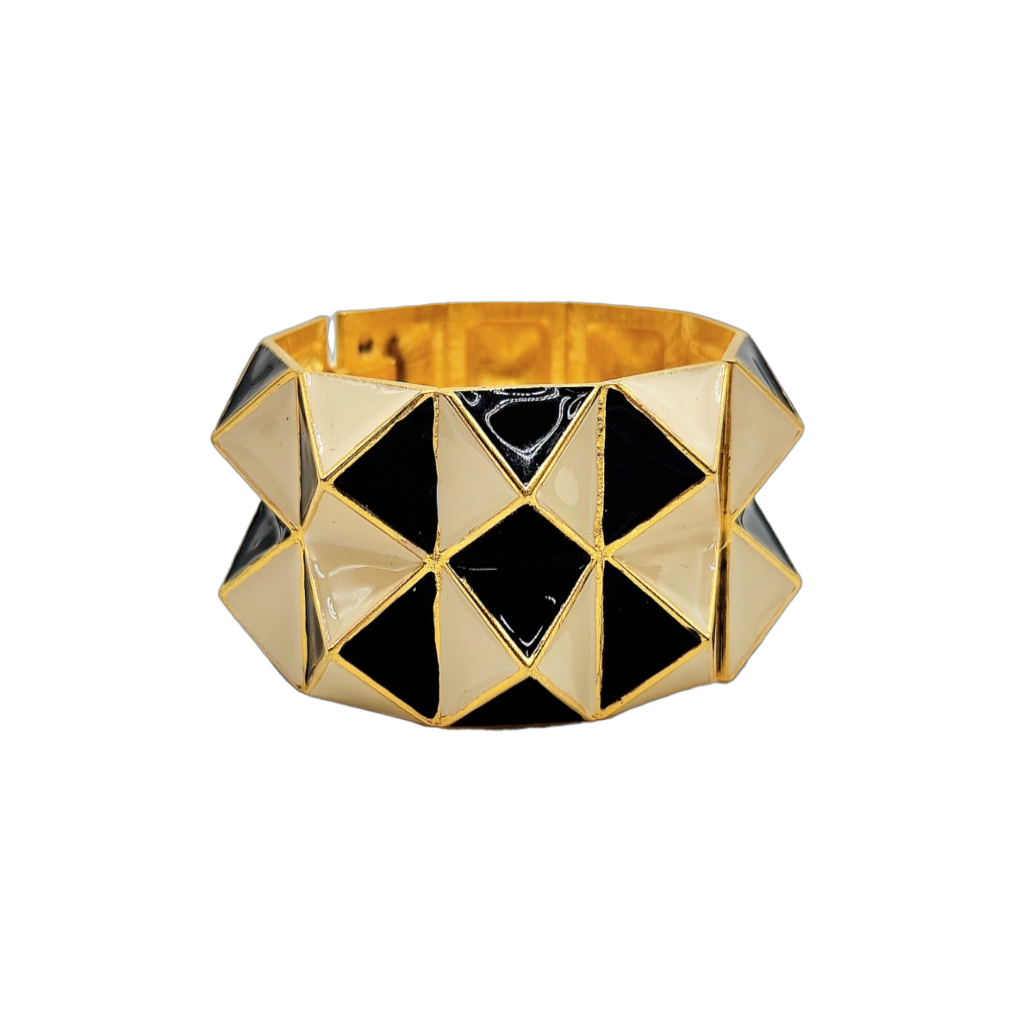 Two rows of black and white enameling in a pyramid shape over 22-karat gold plating makes for this unique cuff bracelet.