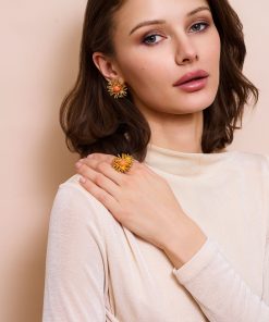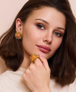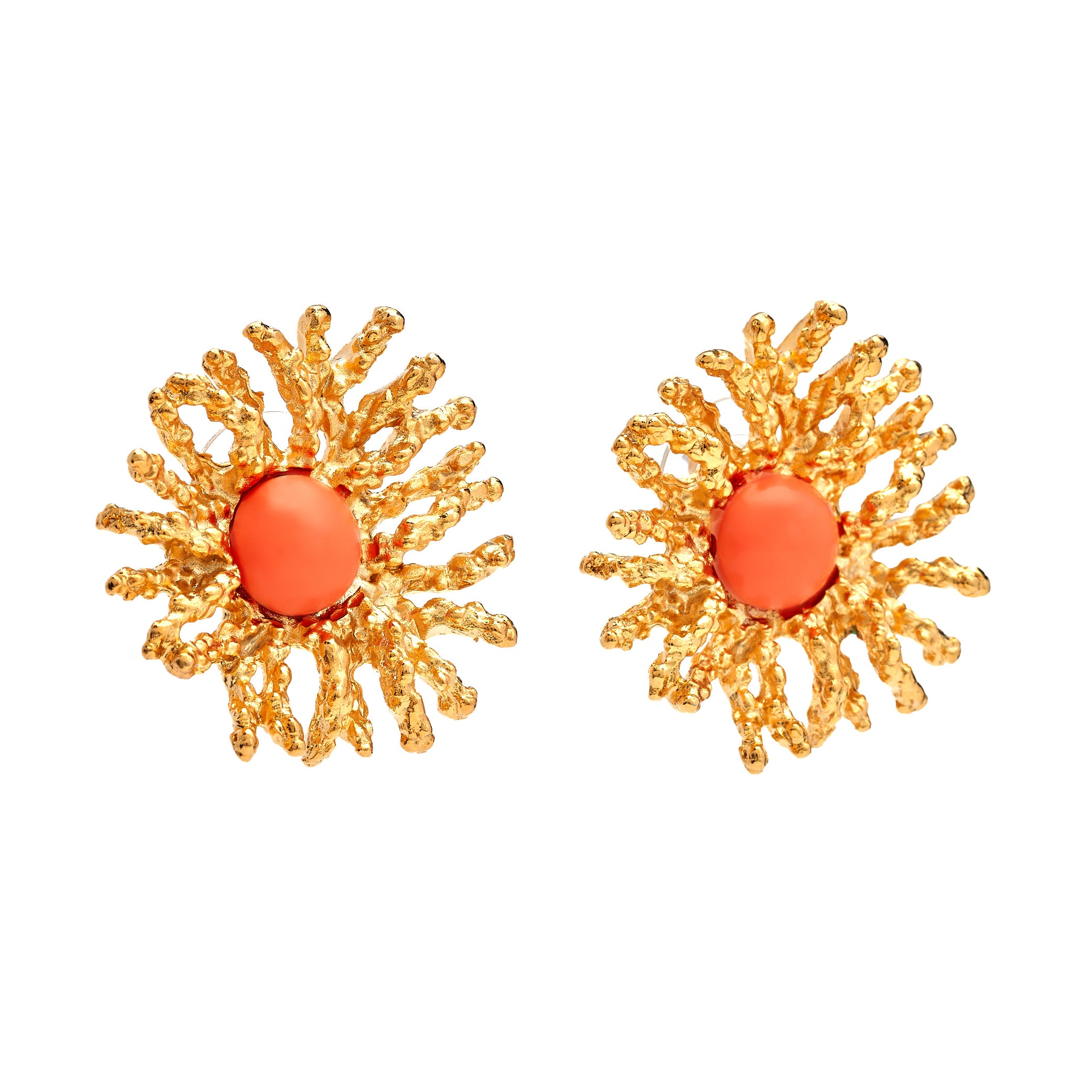 These are gold earrings featuring a coral reef design with a striking coral center, adding a nature-inspired elegance to any outfit.