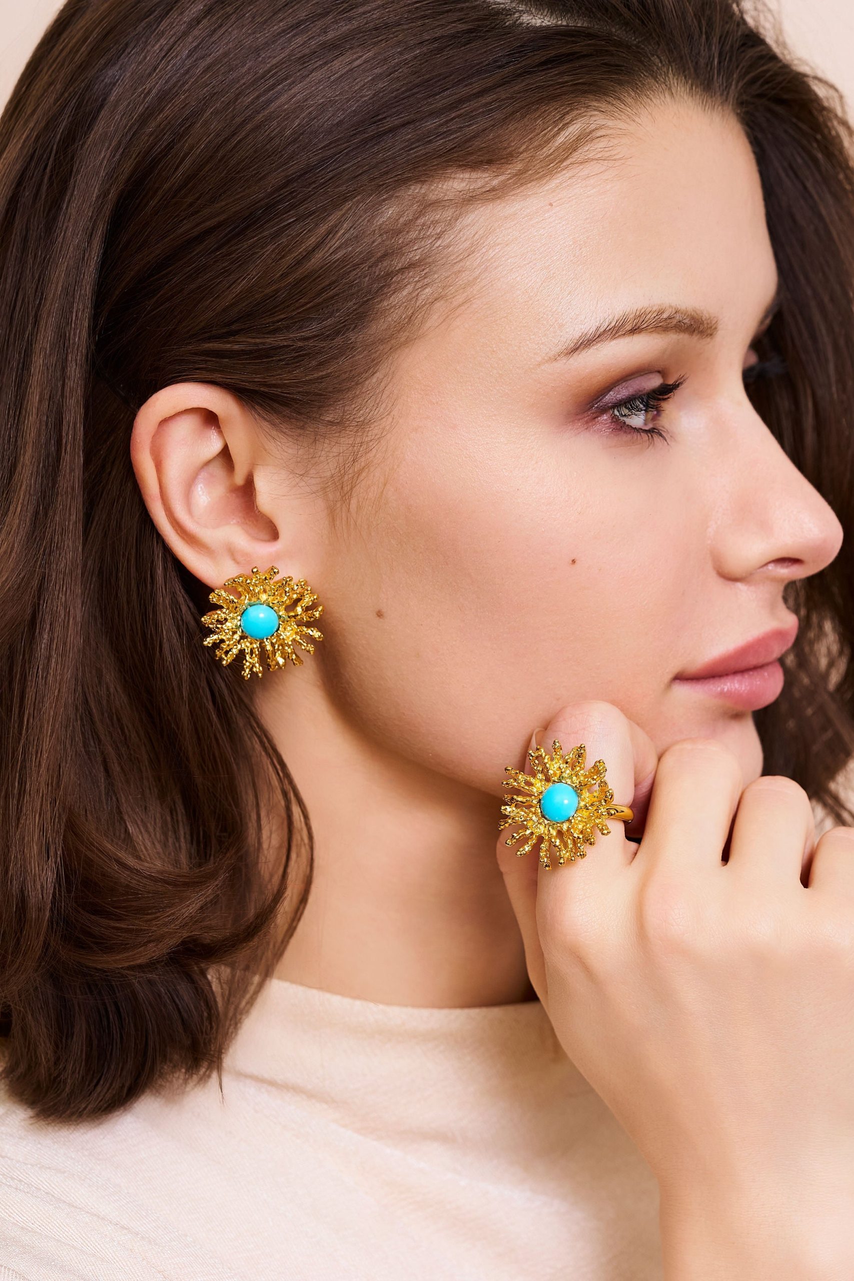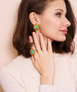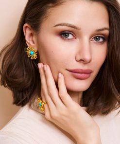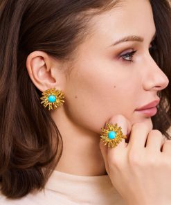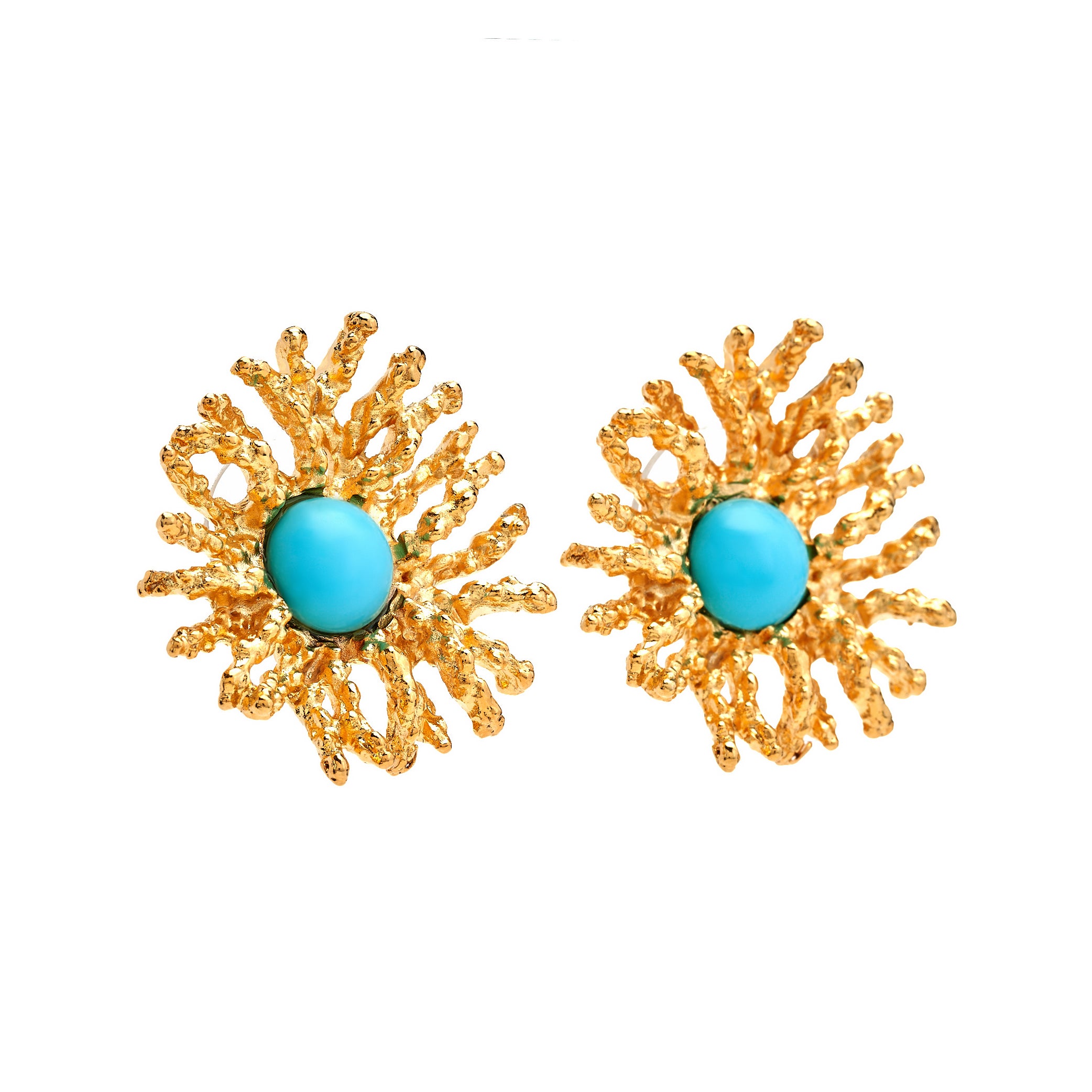These are gold earrings with a coral reef design and a vibrant turquoise center, perfect for a beach-themed, elegant touch.