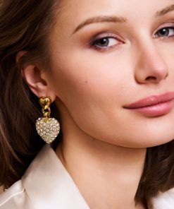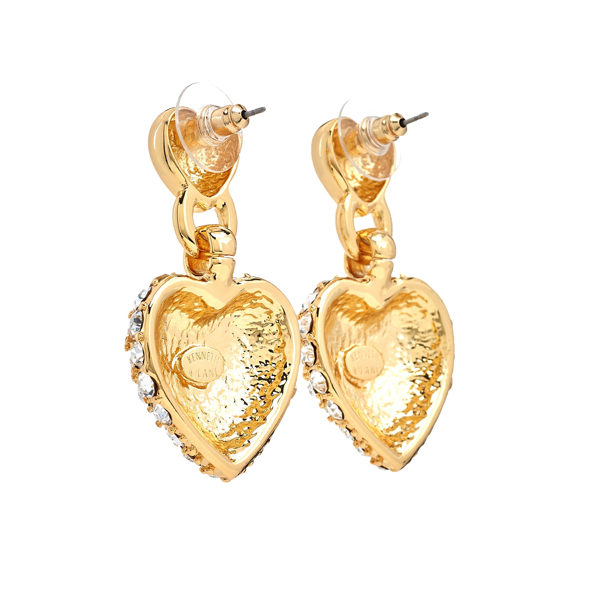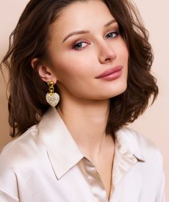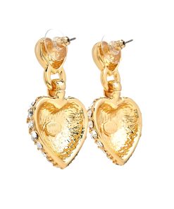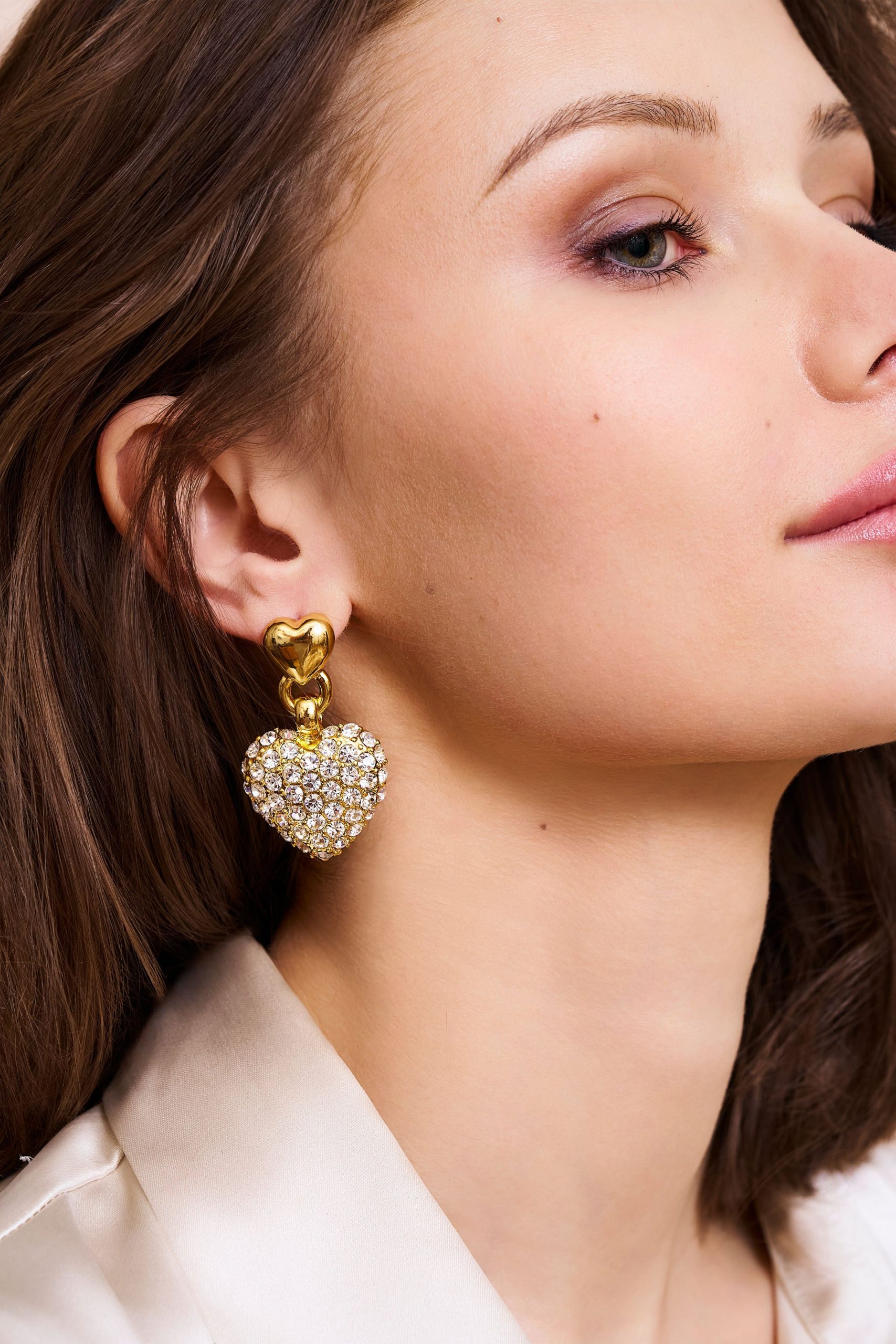 These gold-plated drop pierced earrings feature a gold heart-shaped top and a round crystal cluster heart drop, offering a romantic and sparkling design.