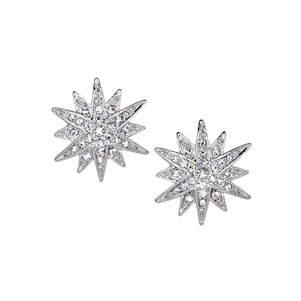 Made in the USA, these stellar rhodium-plated star earrings are vastly studded with glass rhinestones and fit comfortably with a clip-on closure.