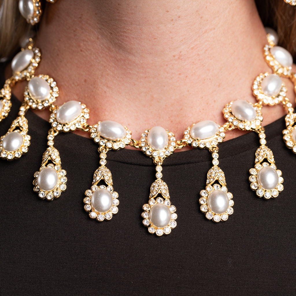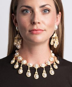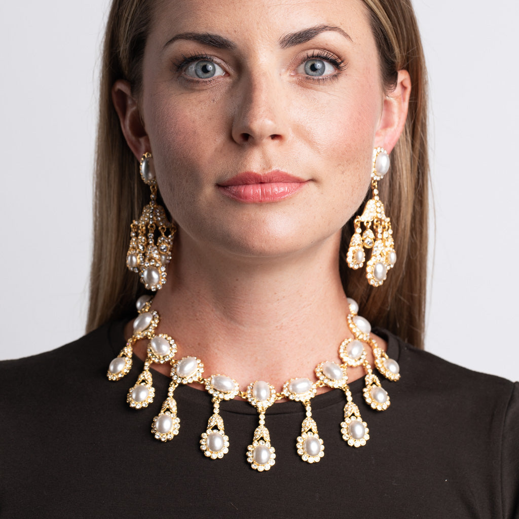 Crystal accents in gold surrounding white Cultura pearls dangle brightly on a collar necklace that brings a mix of play and drama to any outfit at any occasion.