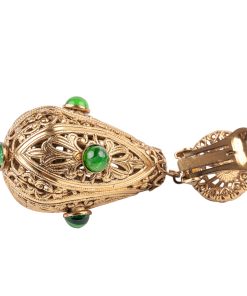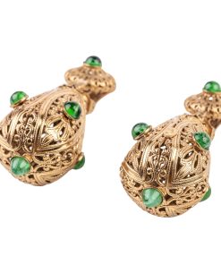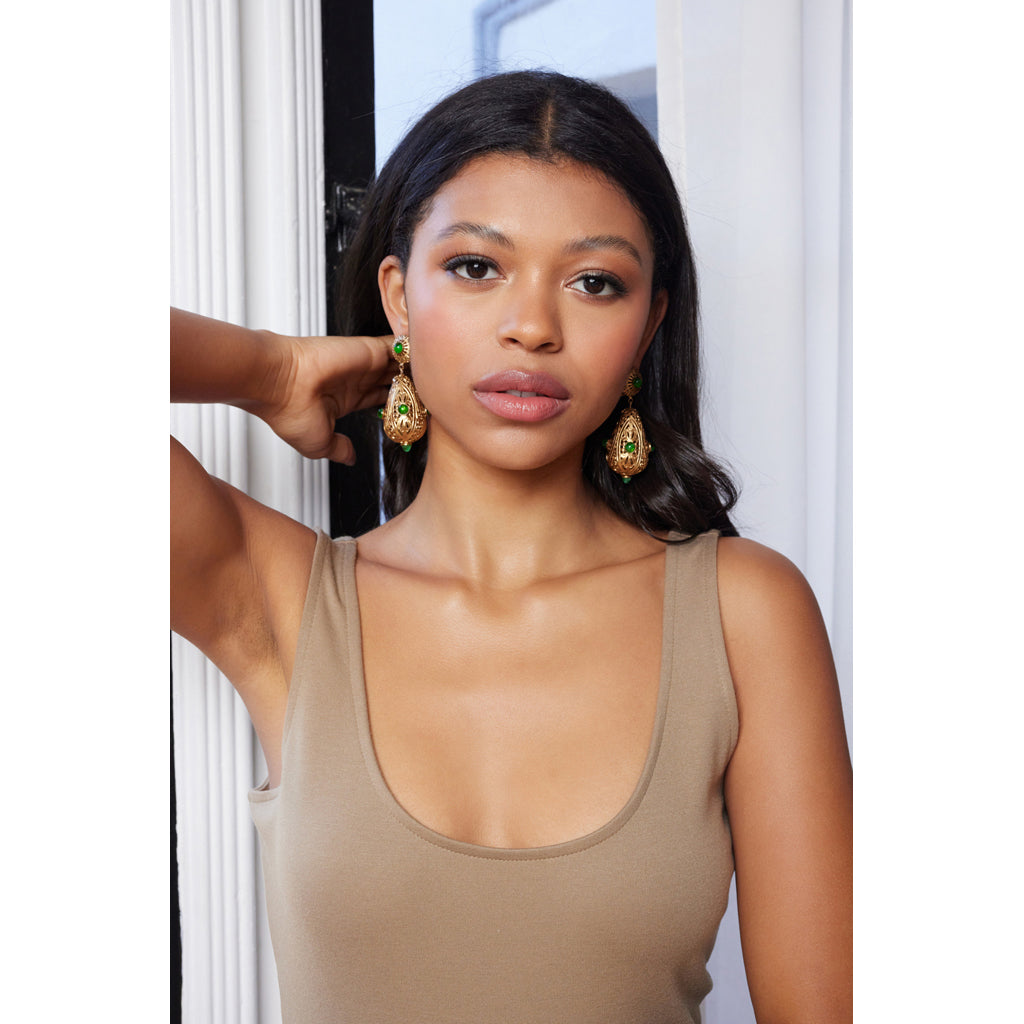 Part of Kenneth Jay Lane’s larger Filigree Collection, this antique gold-plated drop clip-on earring is embellished with glass emerald stones for the ultimate feeling of romance.