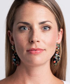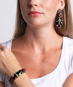 Bright gems shine bright against a black enamel background on these drop clip earrings. Pair with our Gemstone Bangle.