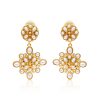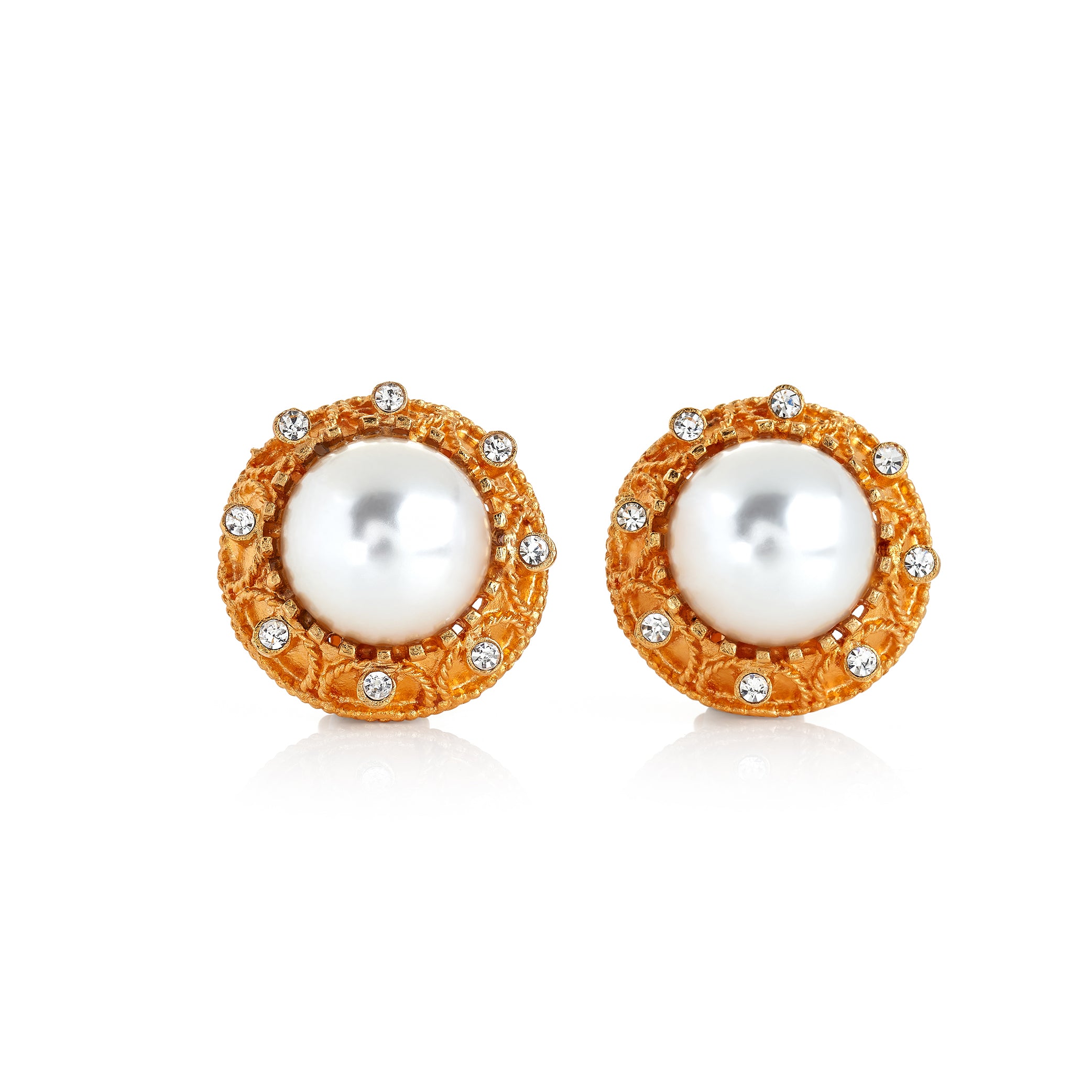 Gold button clip earrings with crystal and pearl center. Button up your style with these gold beauties. These earrings feature sparkling crystals and a stunning pearl center, adding a touch of elegance to any outfit.