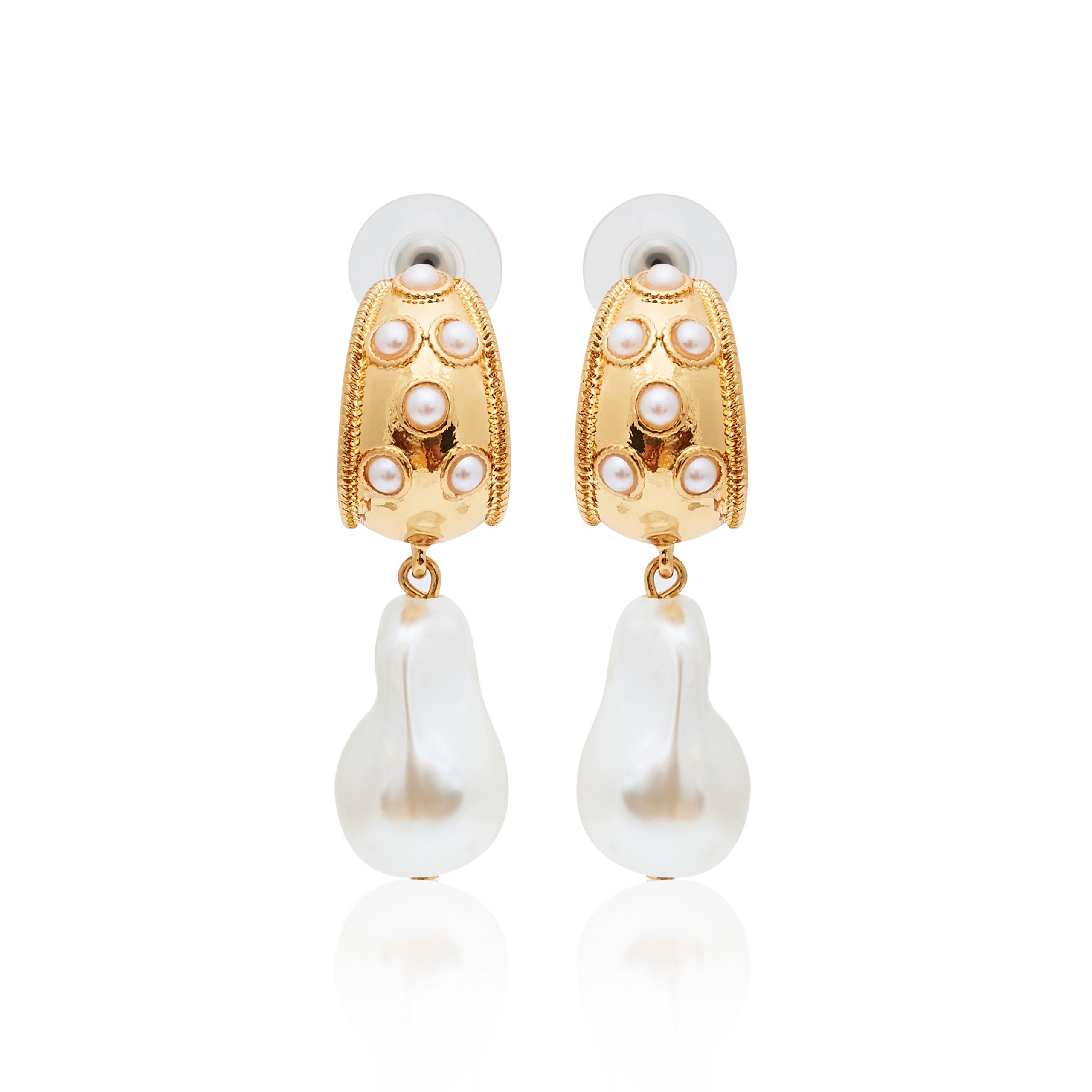 The half hoop design gracefully curves around the earlobe, adding a subtle yet striking accent to your look. Dangling delicately from each hoop is a lustrous pearl, chosen for its luminous beauty and timeless appeal.