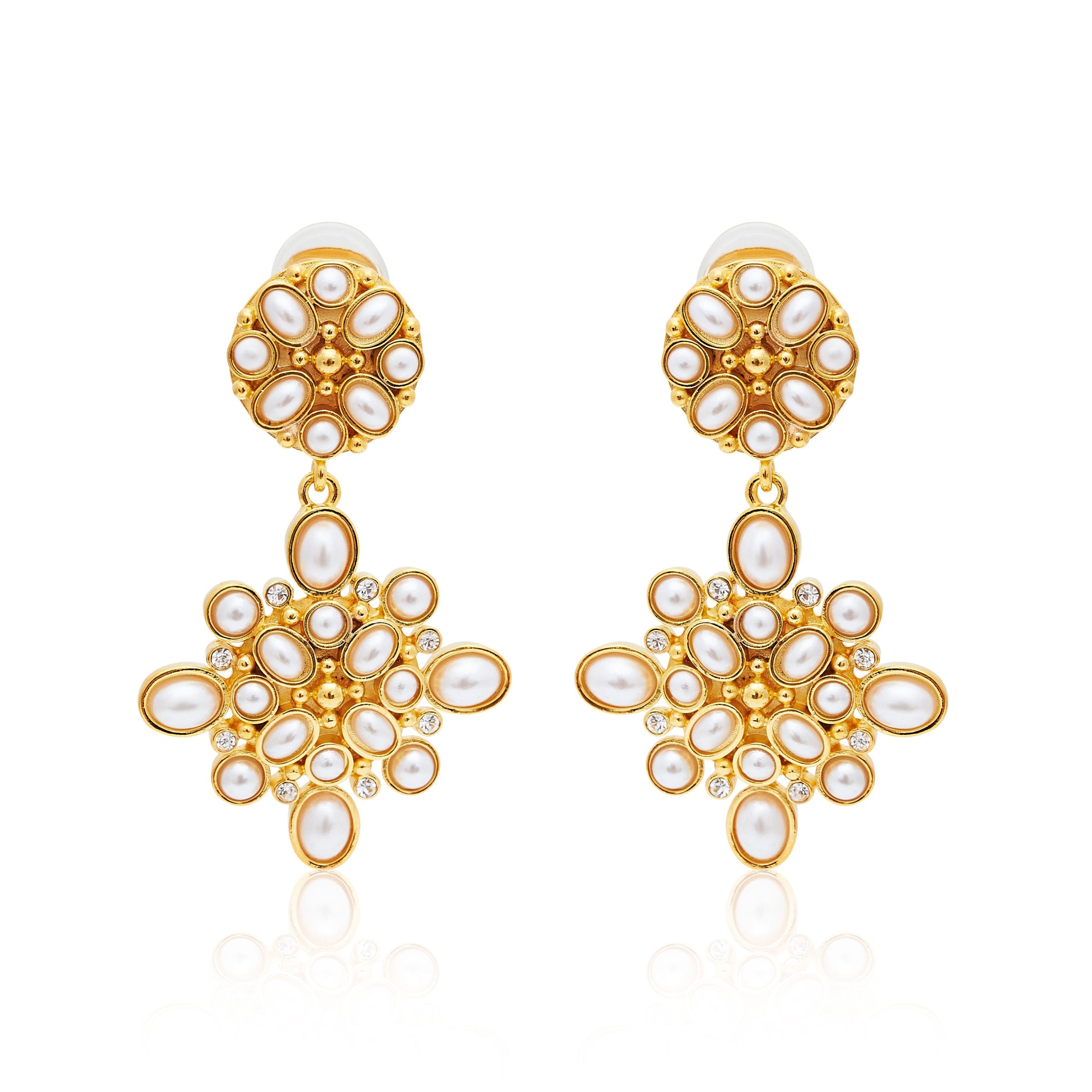 At the heart of each earring are radiant pearl cabochons, showcasing the natural beauty and iridescence of freshwater pearls. The smooth, rounded surface of the pearls exudes a sense of refined luxury, while the gold settings add a touch of warmth and opulence.