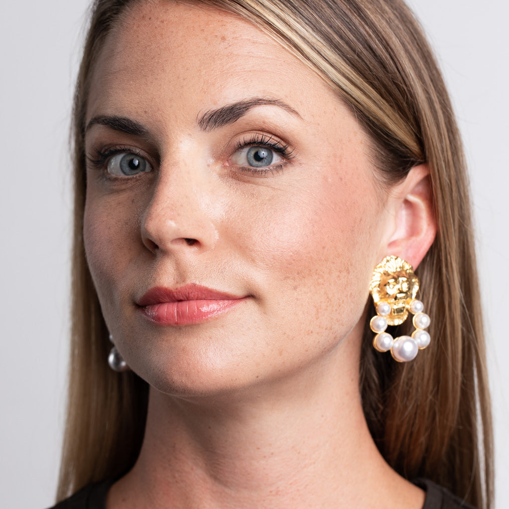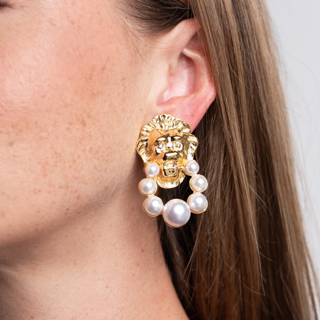 Introducing our Lion Head and Pearl Doorknocker Clip Earrings, a true representation of regal charm and elegance, thoughtfully crafted by Kenneth Jay Lane. These captivating earrings showcase the commanding presence of lion head motifs alongside the classic allure of lustrous pearls, making them a bold and sophisticated addition to your jewelry collection.