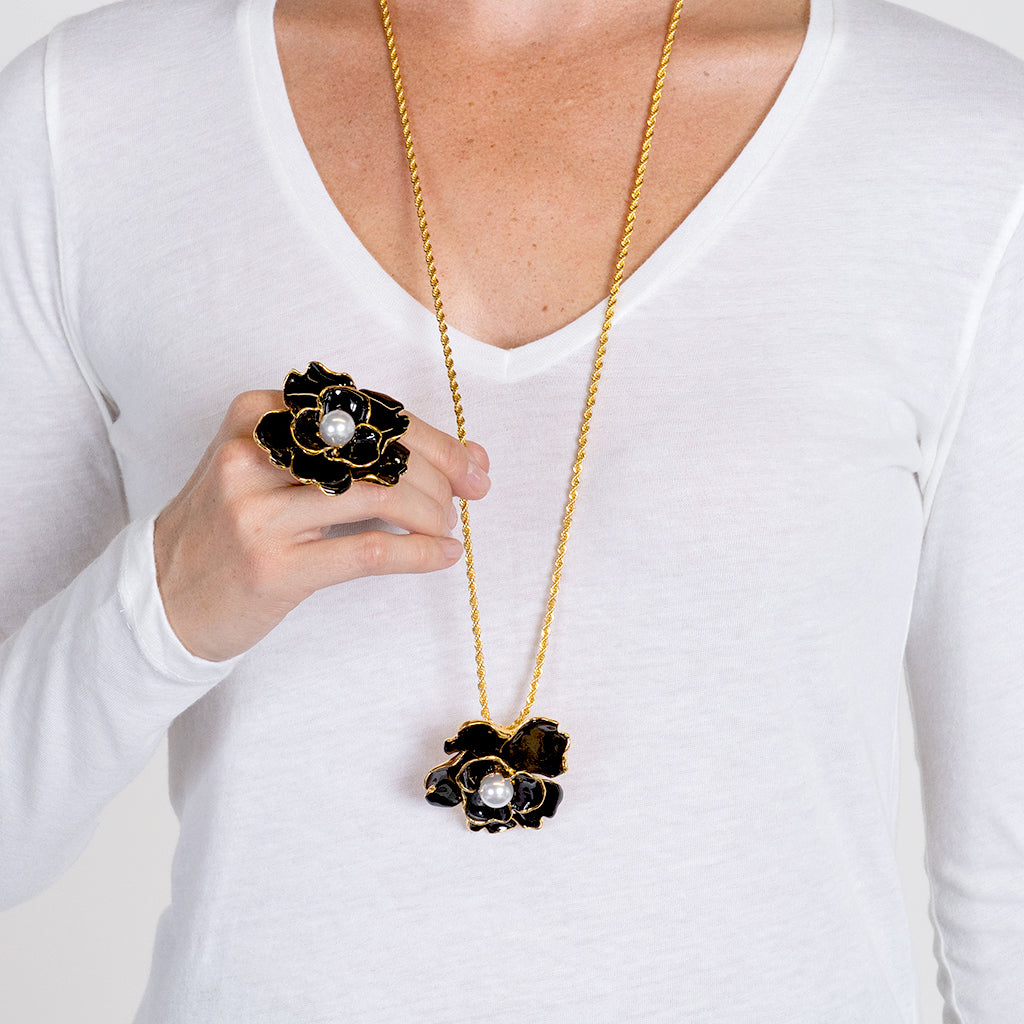 Pretty and playful, this necklace features an intricate black and gold enamel flower with a cultura pearl at the center. Pair with our Black Enamel Flower Ring.