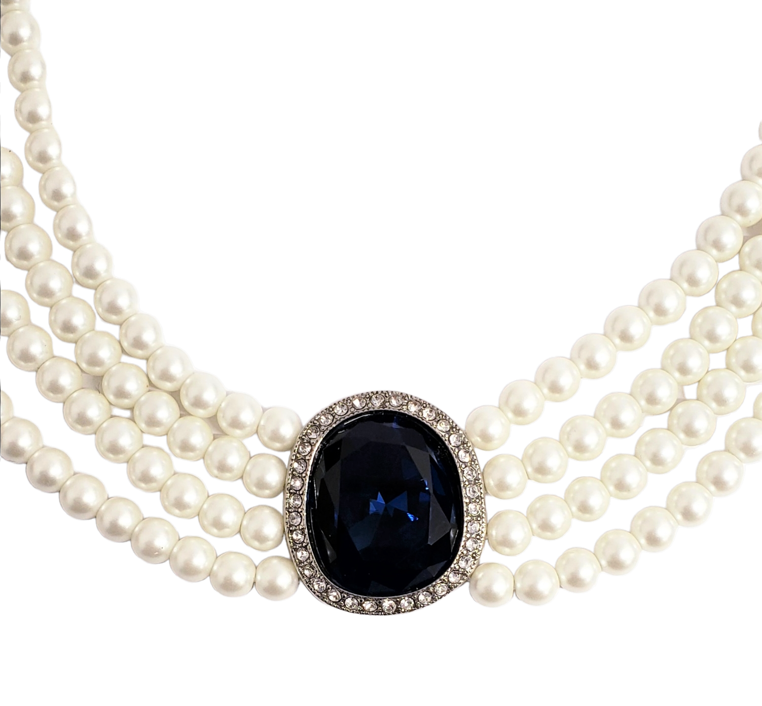 Four rows of beautiful, 6 millimeter glass pearls meet in the middle with a faux sapphire stone adorned with small rhinestones. This choker, once worn by the iconic Princess Diana, is a symbol of royalty and elegance.