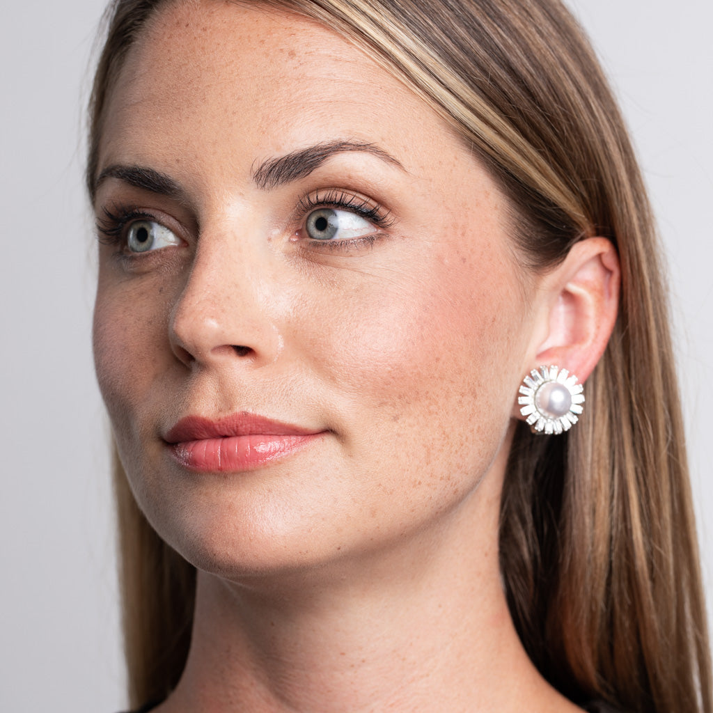 Your new ray of sunshine. A beautiful halo of silver with crystal baguettes surround a pearl ball in a dramatic sunburst design brightens any look.