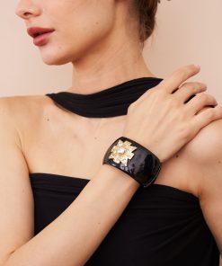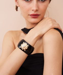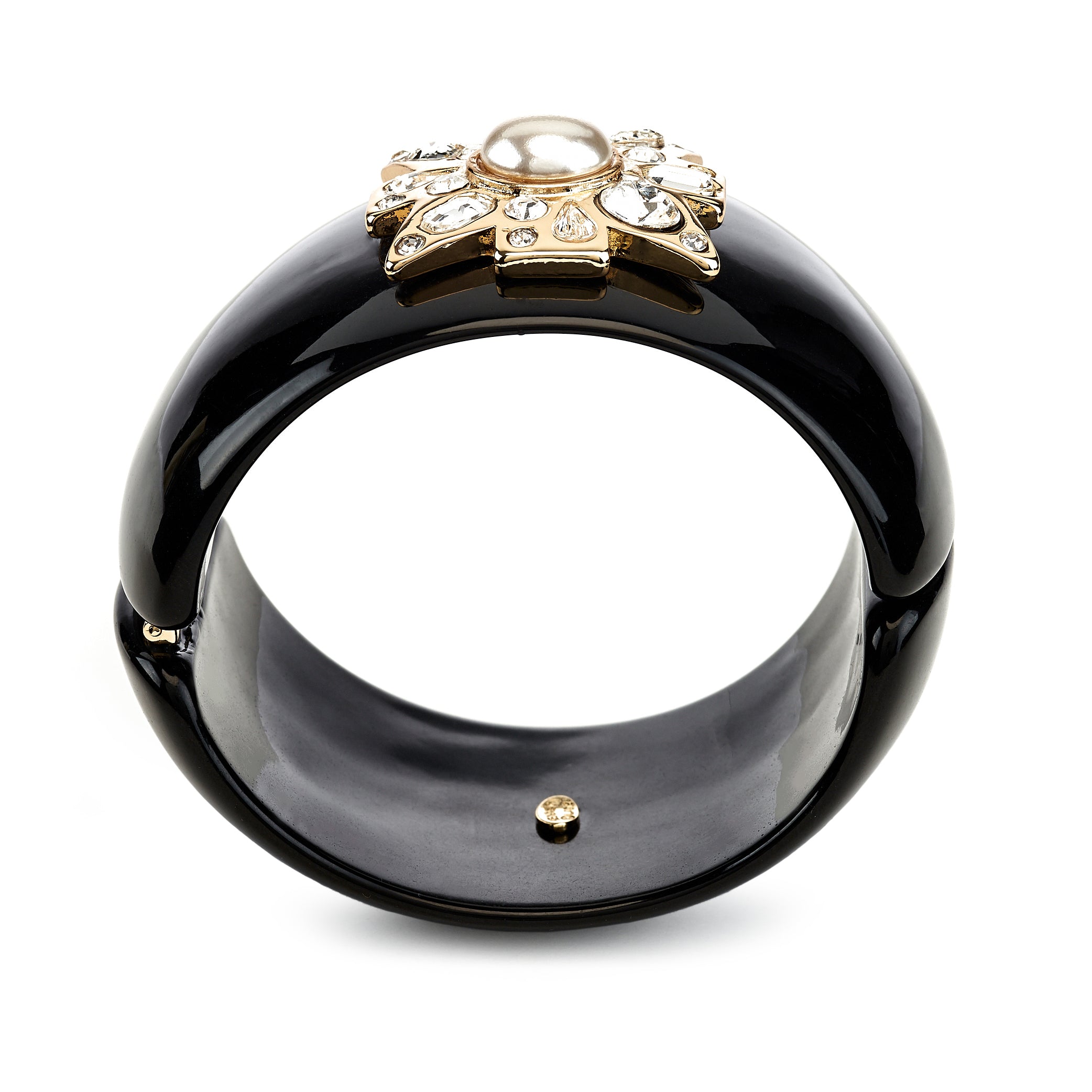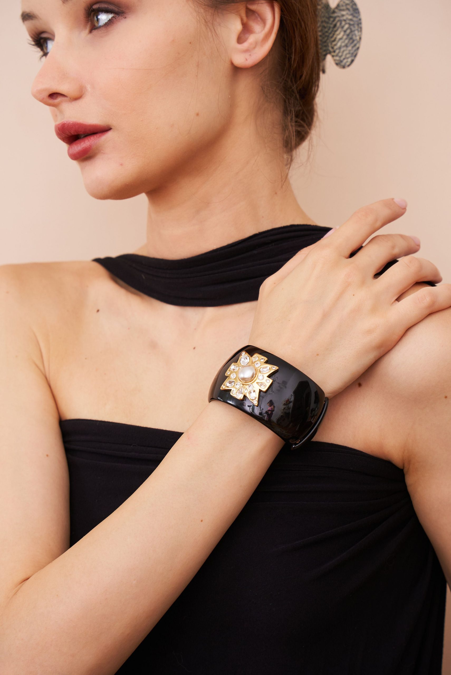 Chic and timeless, this black Maltese cross bracelet features small gold accents, sparkling crystals, and a delicate pearl center for a refined, elegant look. statement.