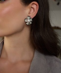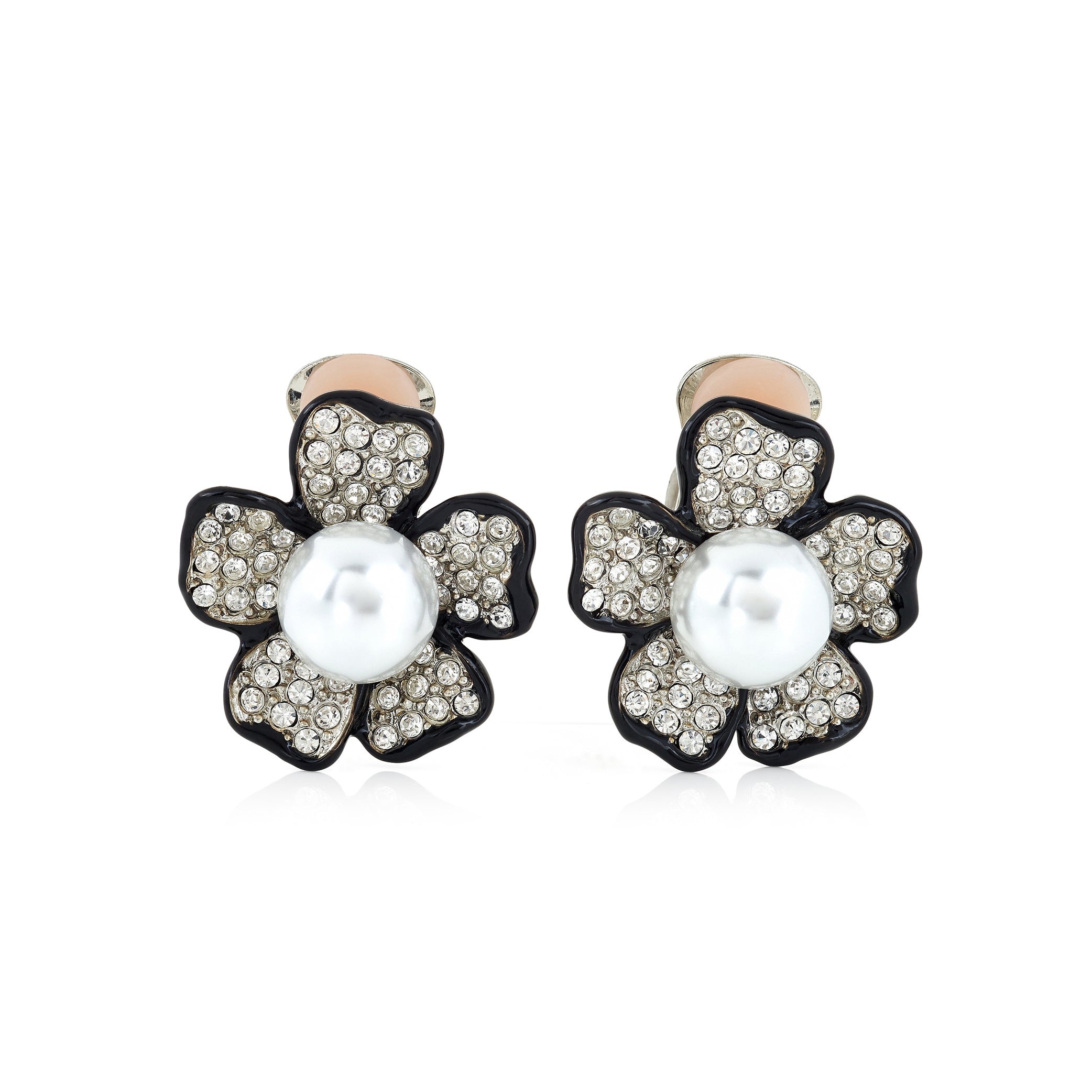 These funky flower clip earrings feature a unique silver and black design with sparkling crystal accents and a striking pearl center. Add some playful flair to your wardrobe with these one-of-a-kind beauties.