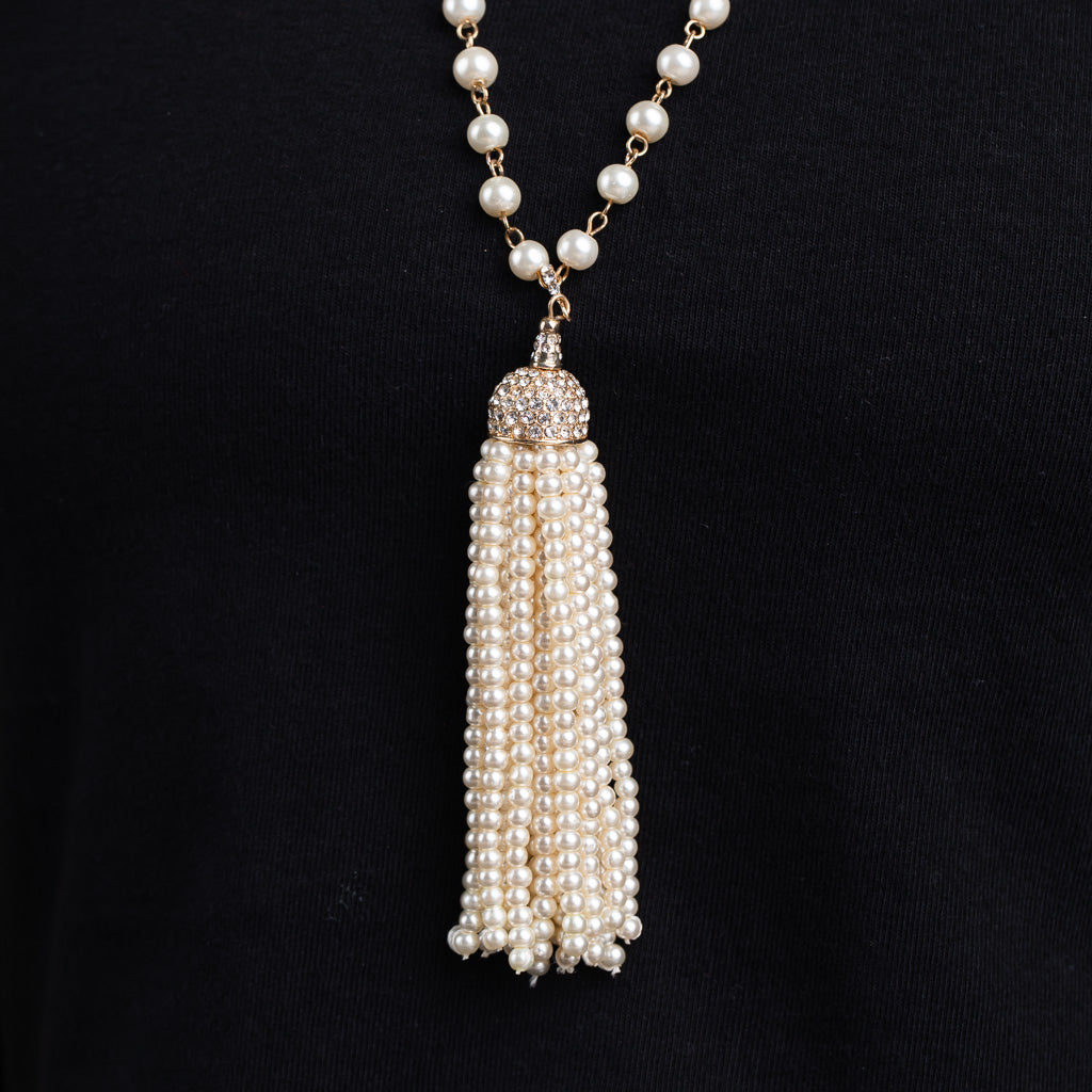 A white pearl tassel with a crystal dome top and gold spacers is the perfect accessory to layer or wear alone. Finished with an “S” clasp.