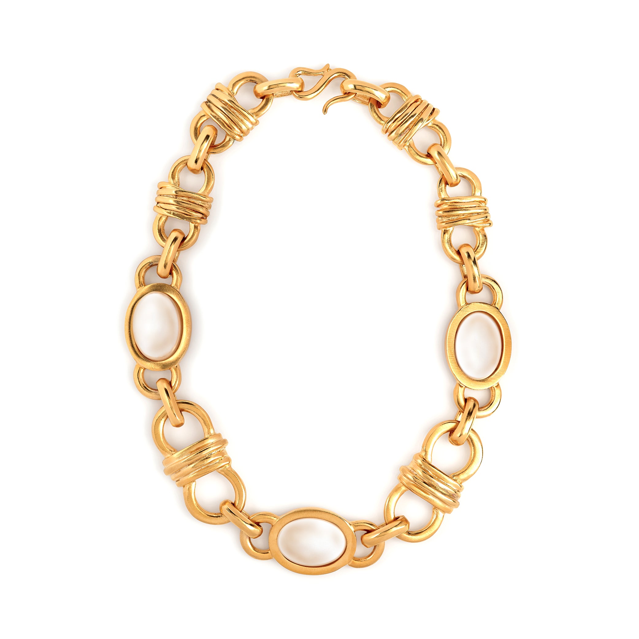 : Satin gold oval link chain with 3 pearl headlight stations necklace Liven up any outfit with this satin gold oval link chain that boasts 3 pearl “headlights” along its length. This necklace is sure to be a conversation starter and a statement piece in your jewelry collection.
