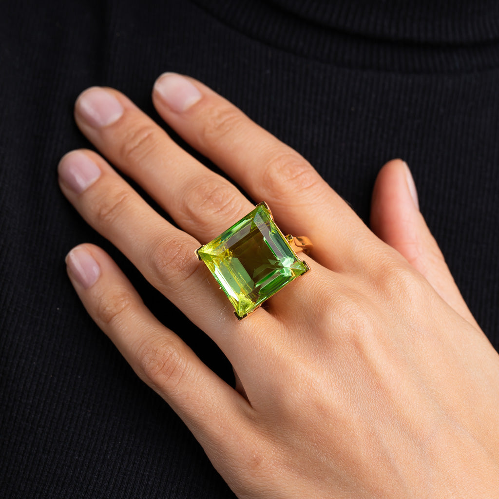 Make a statement on your finger with these stunning, gold-plated adjustable ring finished with a gleaming peridot square-shape center glass stone.