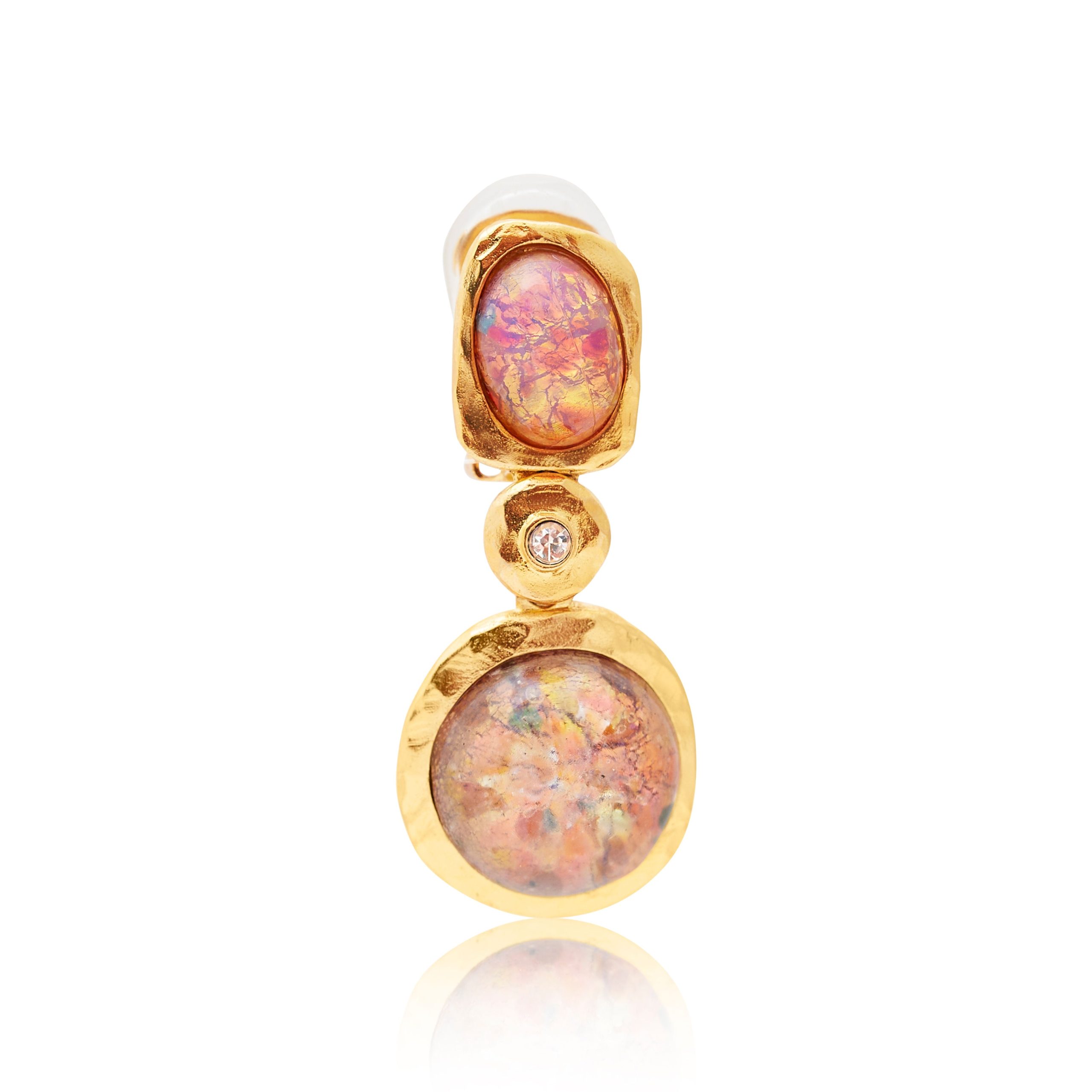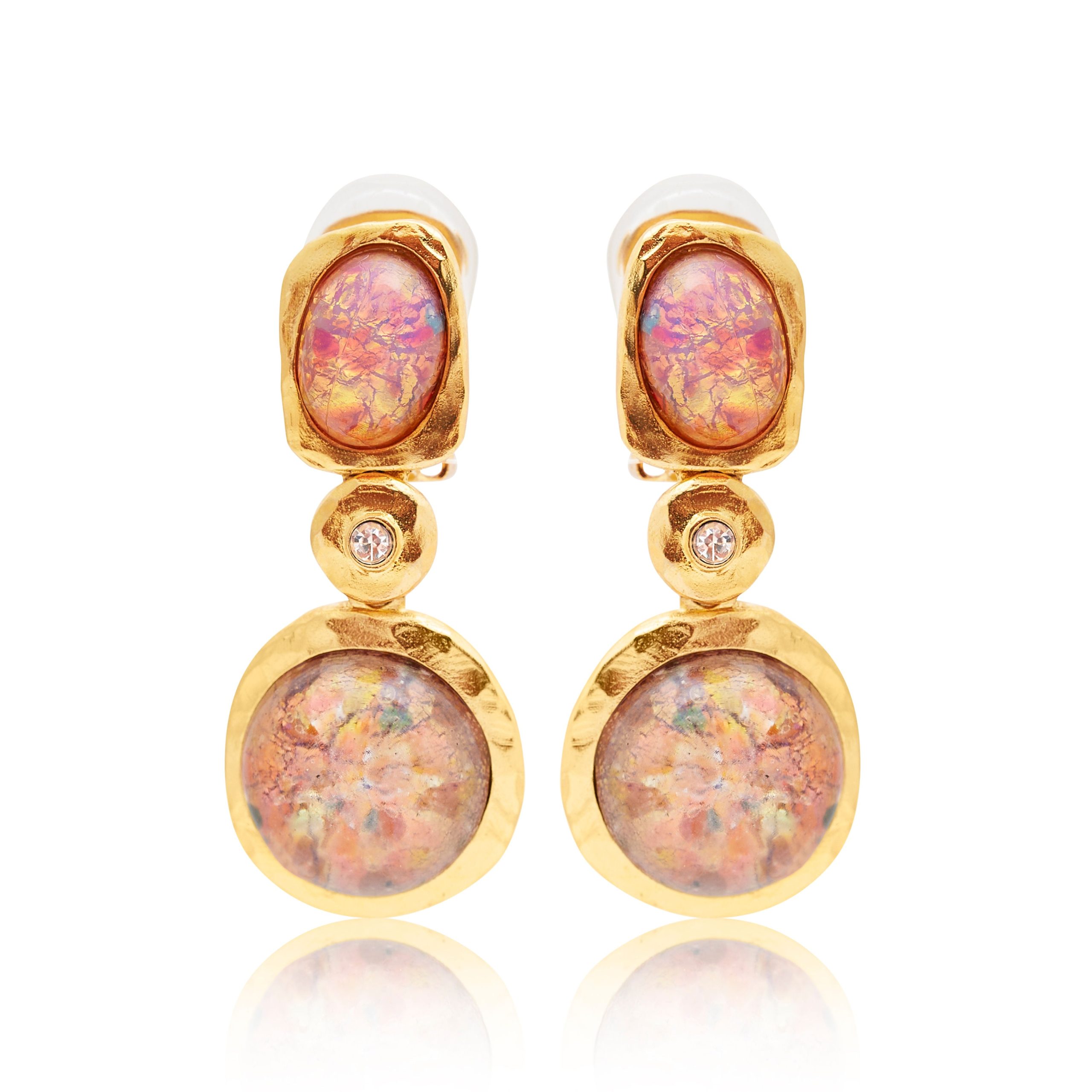 Complete your elegant look with our Pink Opal Earrings. Featuring a stunning yellow gold-plated finish and faux glass pink opal centers, these earrings will add a touch of sophistication to any outfit.