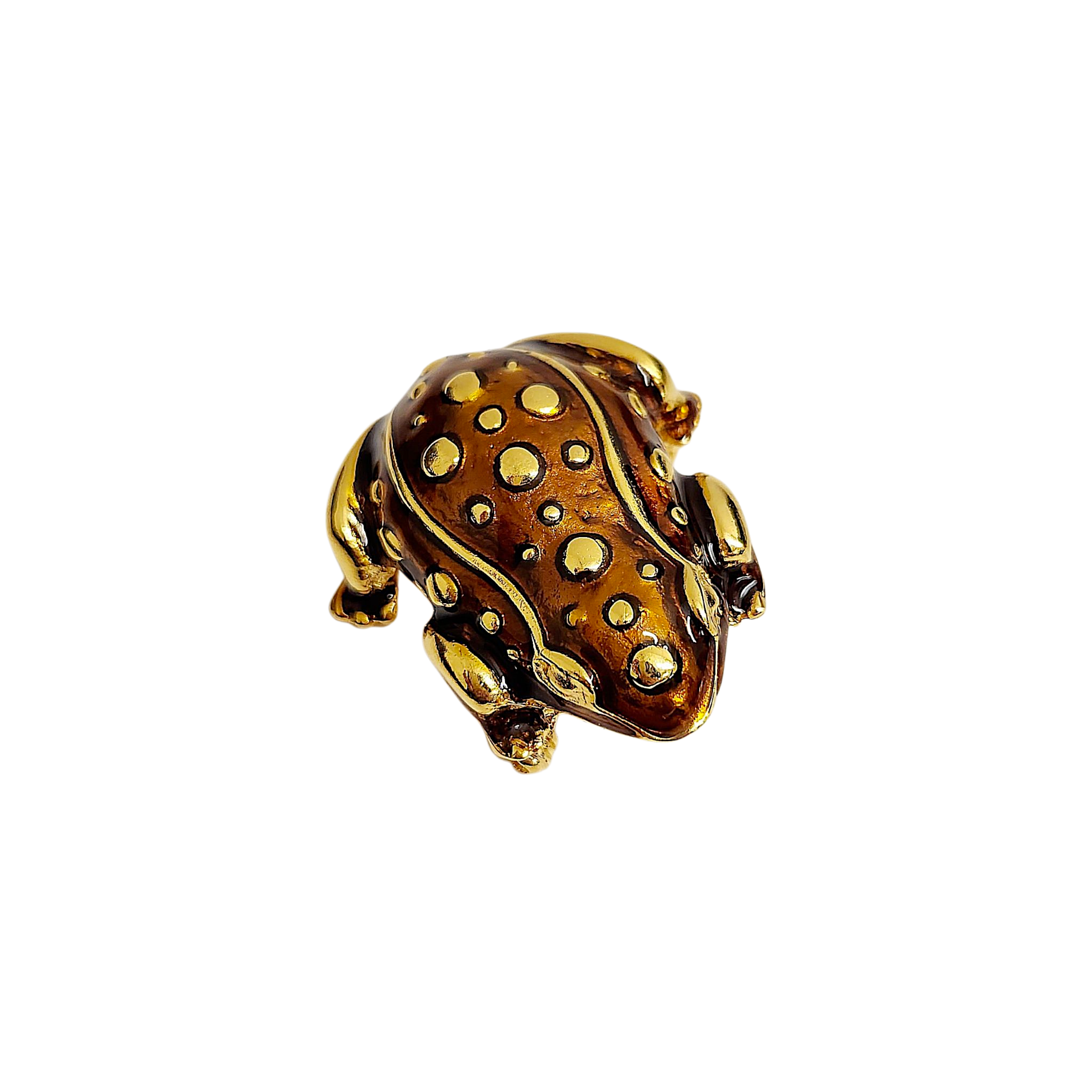 This delightful frog pin measures 1.5″ by 1.5″ and features a playful combination of gleaming gold and dark transparent brown enamel. Its charming design adds a whimsical touch to any outfit.