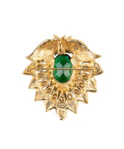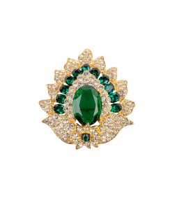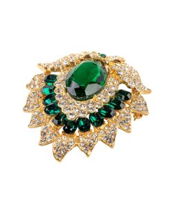 Wear this gold and crystal gem pin with a faceted emeralds center for a luxurious, bold look.