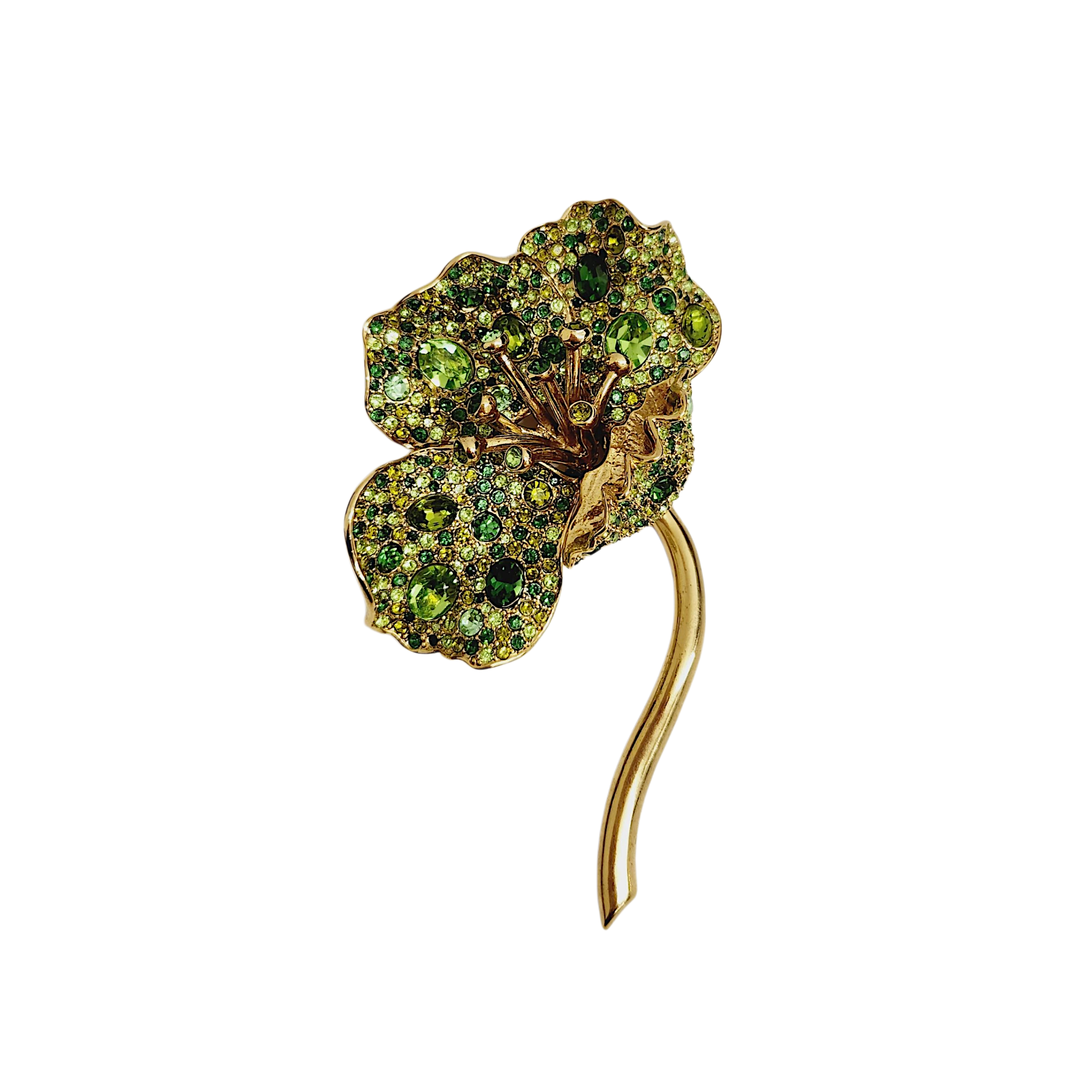 Brighten your look with this playful Long Stem Flower Pin. Measuring 4.75″ by 3.25″, it features a light antique gold finish accented with sparkling multi-green stones.