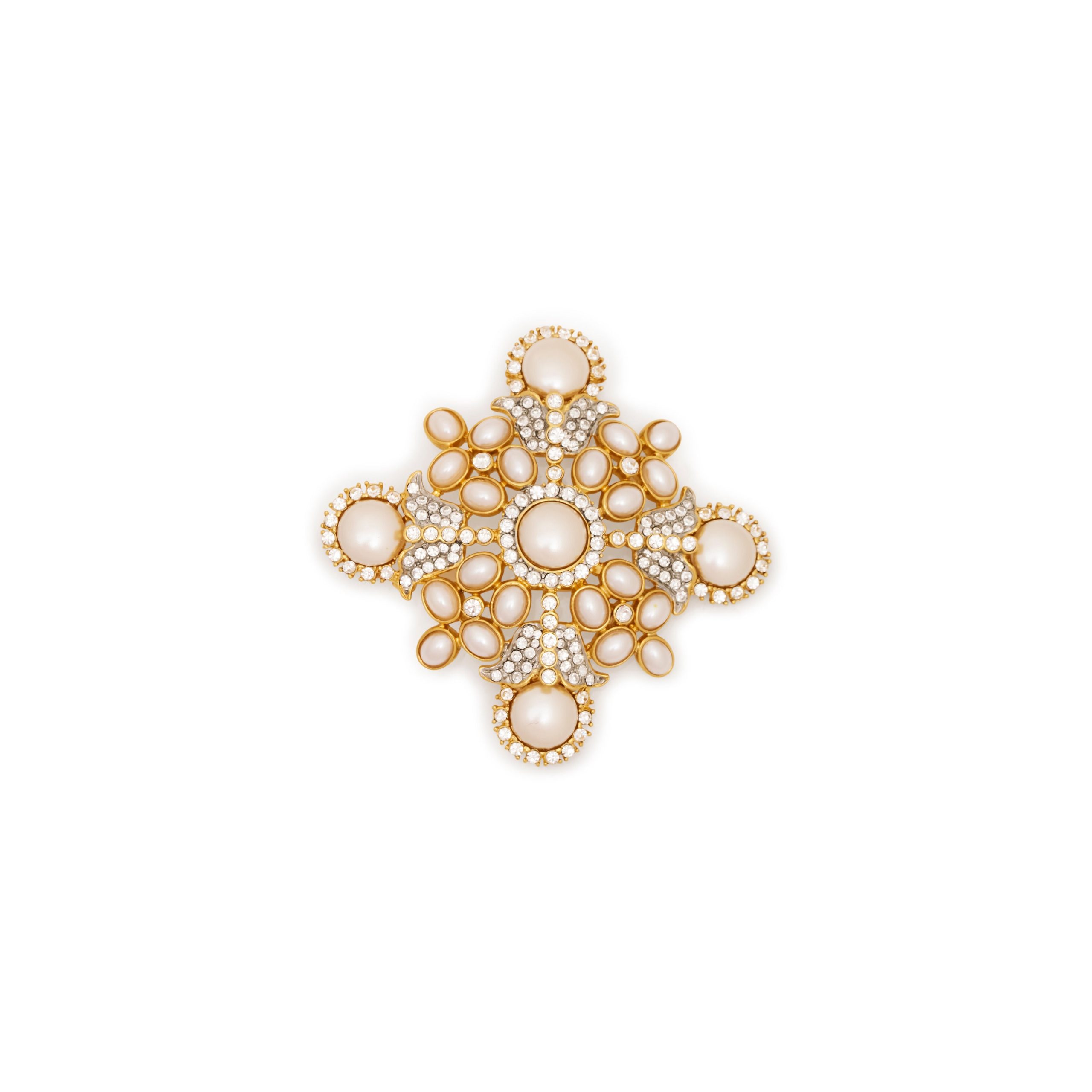 Add a touch of sparkle to any outfit with our Rhinestone Cluster Pin! This playful pin features a gold and two-tone design, adorned with dazzling rhinestones and pearl cabochons.