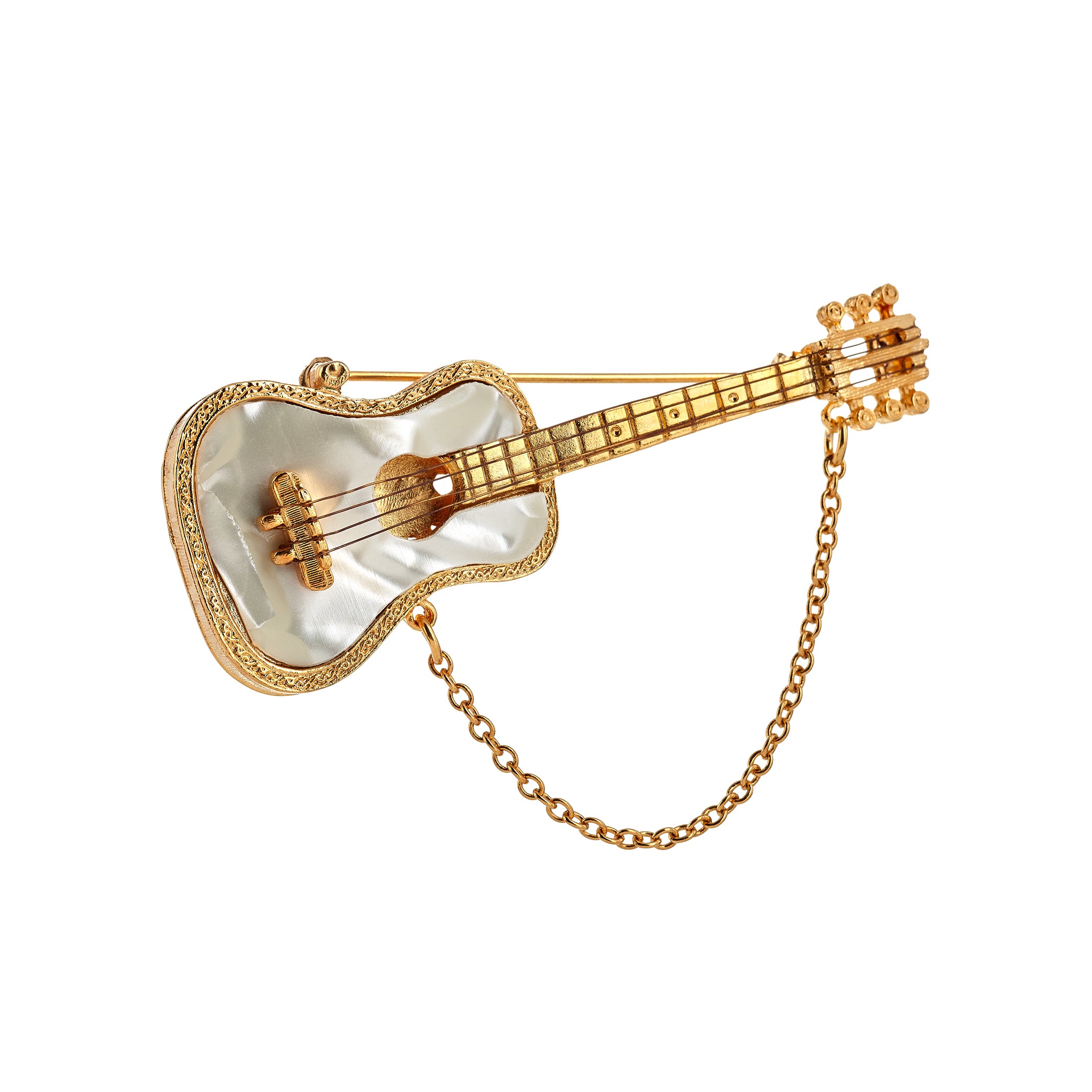 Strum in style with our Vintage Guitar Pin, featuring a gold and mother of pearl design. The perfect accessory for any music lover, this pin adds a touch of class to any outfit.