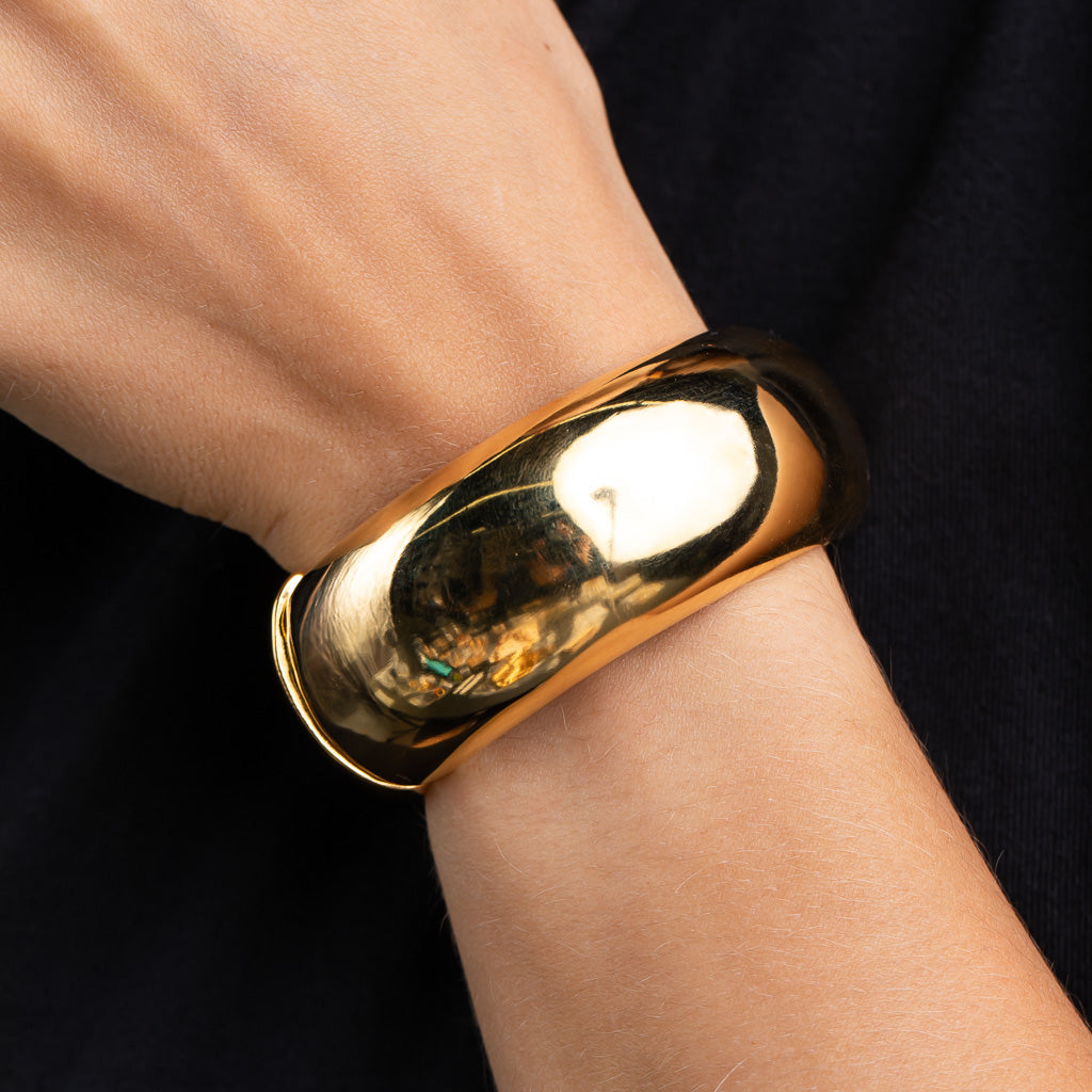 This modern polished gold dome profile statement cuff is bold and shiny. Finished with a hinged closure.