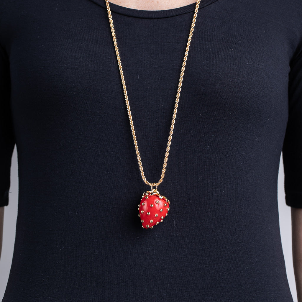 This bright and fun pendant necklace will have you craving strawberries for days. Red strawberry pendant with gold accents. Wears as tasteful as it looks with a delicious red coloring to brighten any outfit.