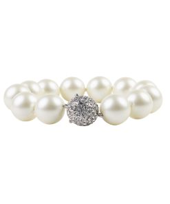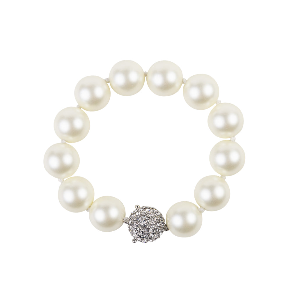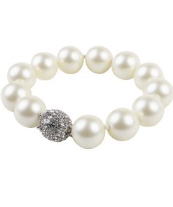 Simple yet beautiful in design, this gleaming pearl bracelet consists of 16 millimeter glass cultured pearls with a stunning magnetic rhinestone ball clasp.