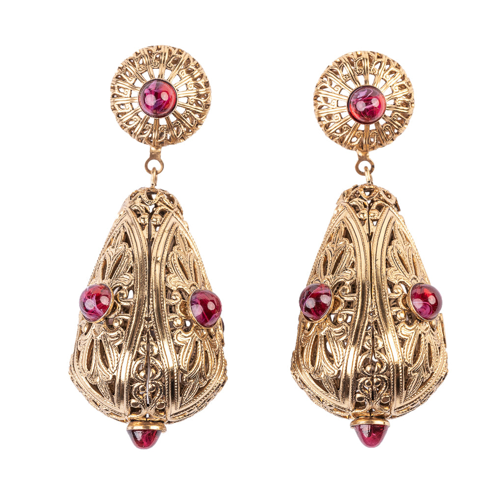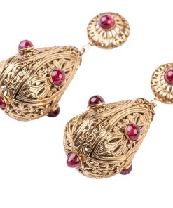 Part of Kenneth Jay Lane’s Filigree Collection, this antique gold-plated drop earring is embellished with glass ruby stones for the ultimate feeling of romance.