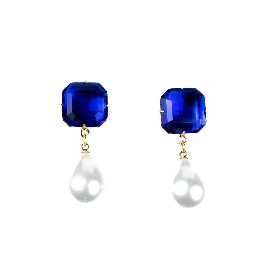 These gold with square sapphire and pearl drop pierced earring are timelessly chic, fashioning a luxurious, elegant statement. Refined gold provides the backdrop for a square sapphire center and dainty pearl drop, resulting in an exquisite piece of artistry fit for any special occasion.