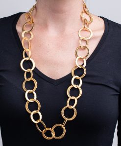 This satin gold circle link necklace can be worn single or double layered, day or night for versatility.