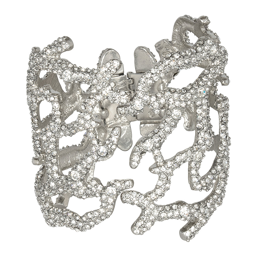 Coral branches in silver and crystal create a timeless statement hinged bracelet.