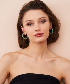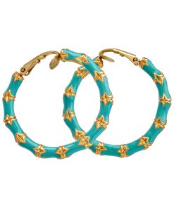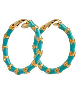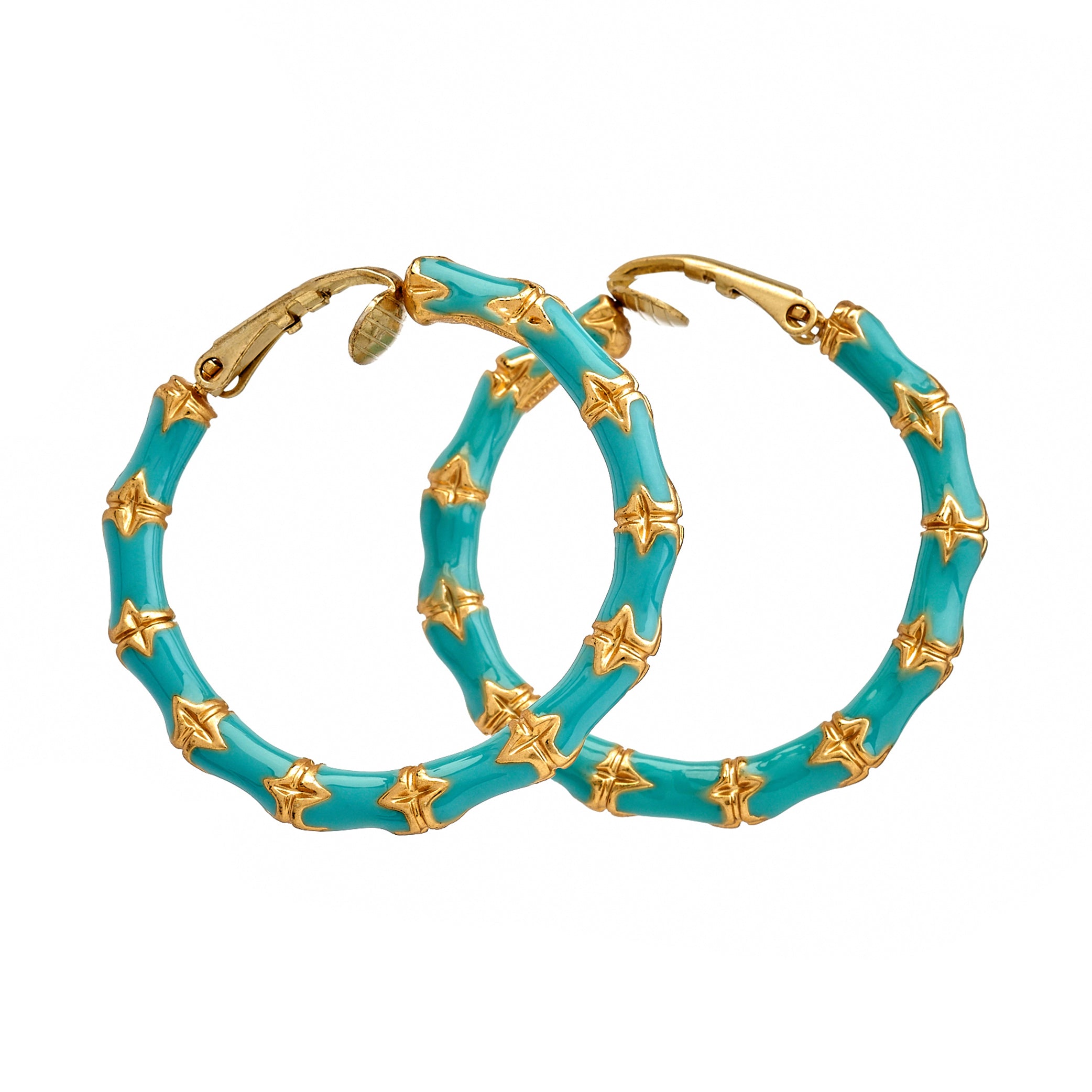 Fresh and fun, these small gold and turquoise enamel bamboo hoop clip-on earrings bring a lively burst of color to your everyday style.