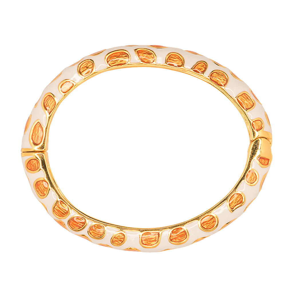 Channel your animal instincts with this giraffe inspired spring hinge bangle. This delicate bangle is gold plated and features white enamel with tan spots accents. Wear alone or layer for a stacked look.