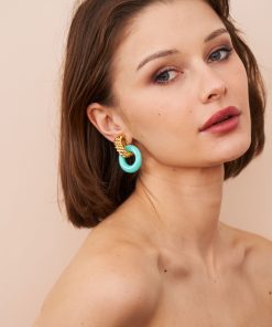 doorknocker earrings, featuring a polished gold-plated, ribbed top and vibrant turquoise resin bottom for a bold, stylish look.