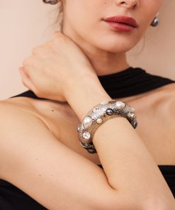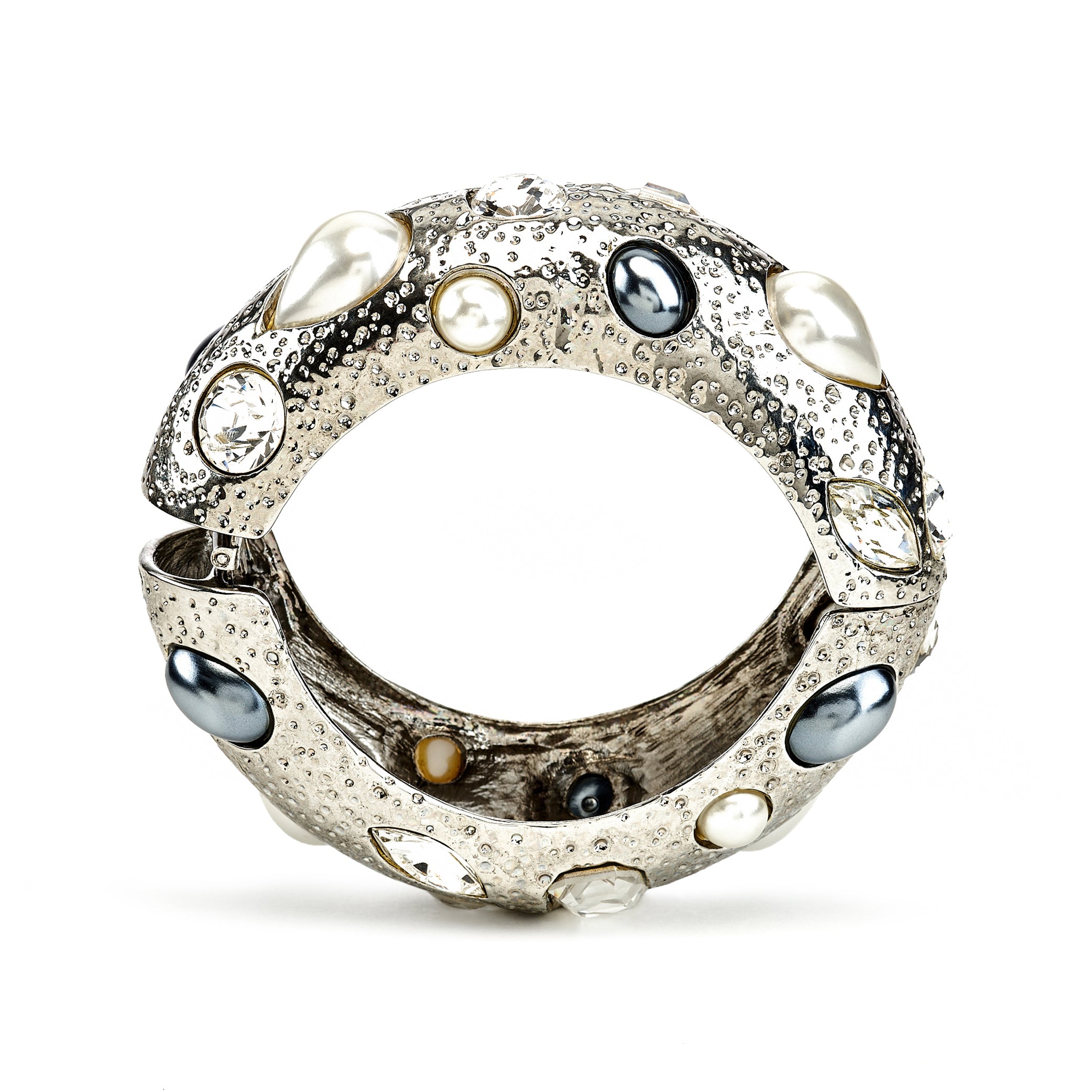 A light antique silver hinged bangle bracelet featuring white and grey pearls with delicate crystal accents for an effortlessly elegant two-tone finish.