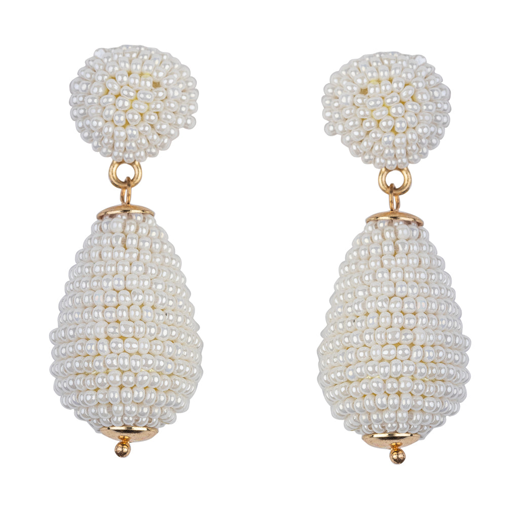 There is no such thing as too many beads! These gorgeous gold and white seed bead pierced earrings with circle top and rounded drop are the perfect example.