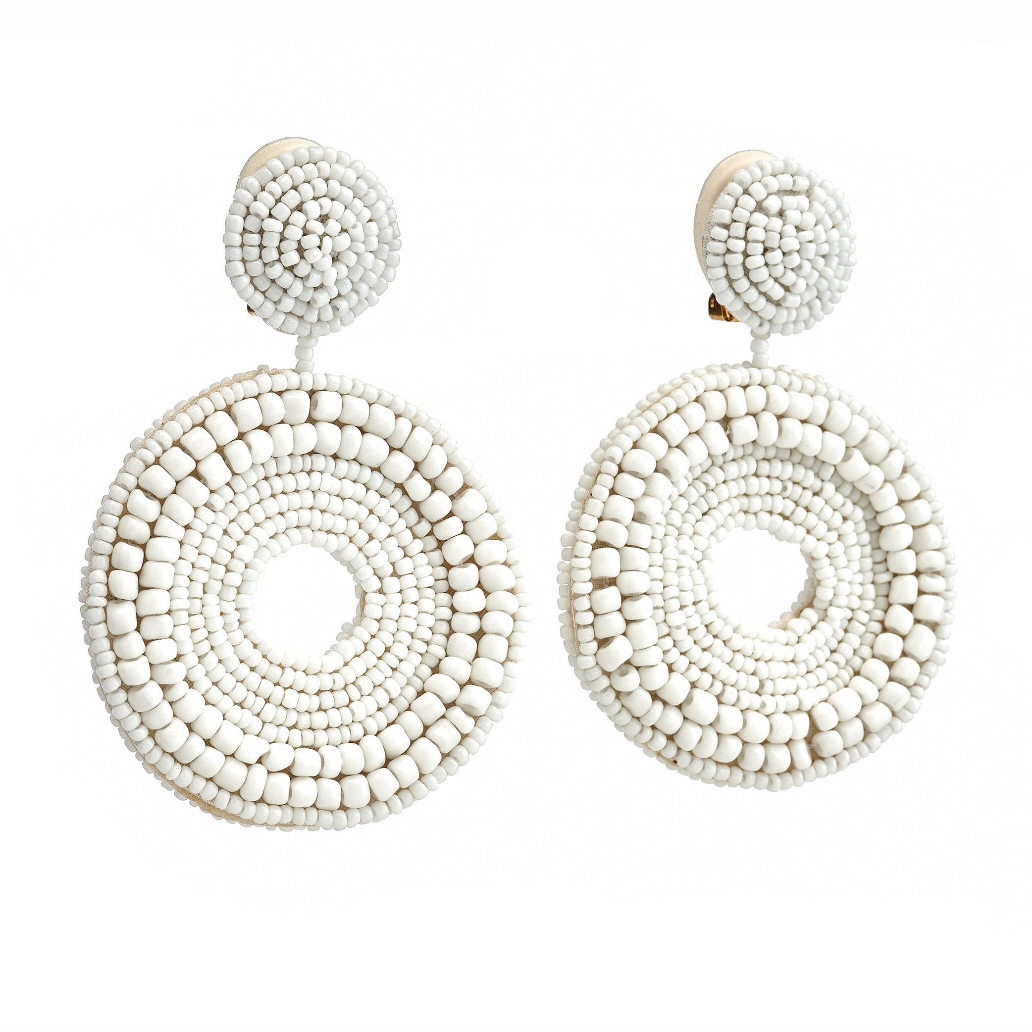 Chic and versatile, these white seed bead circle drop clip-on earrings add a delicate, textured touch to any outfit, perfect for both casual and dressy looks.